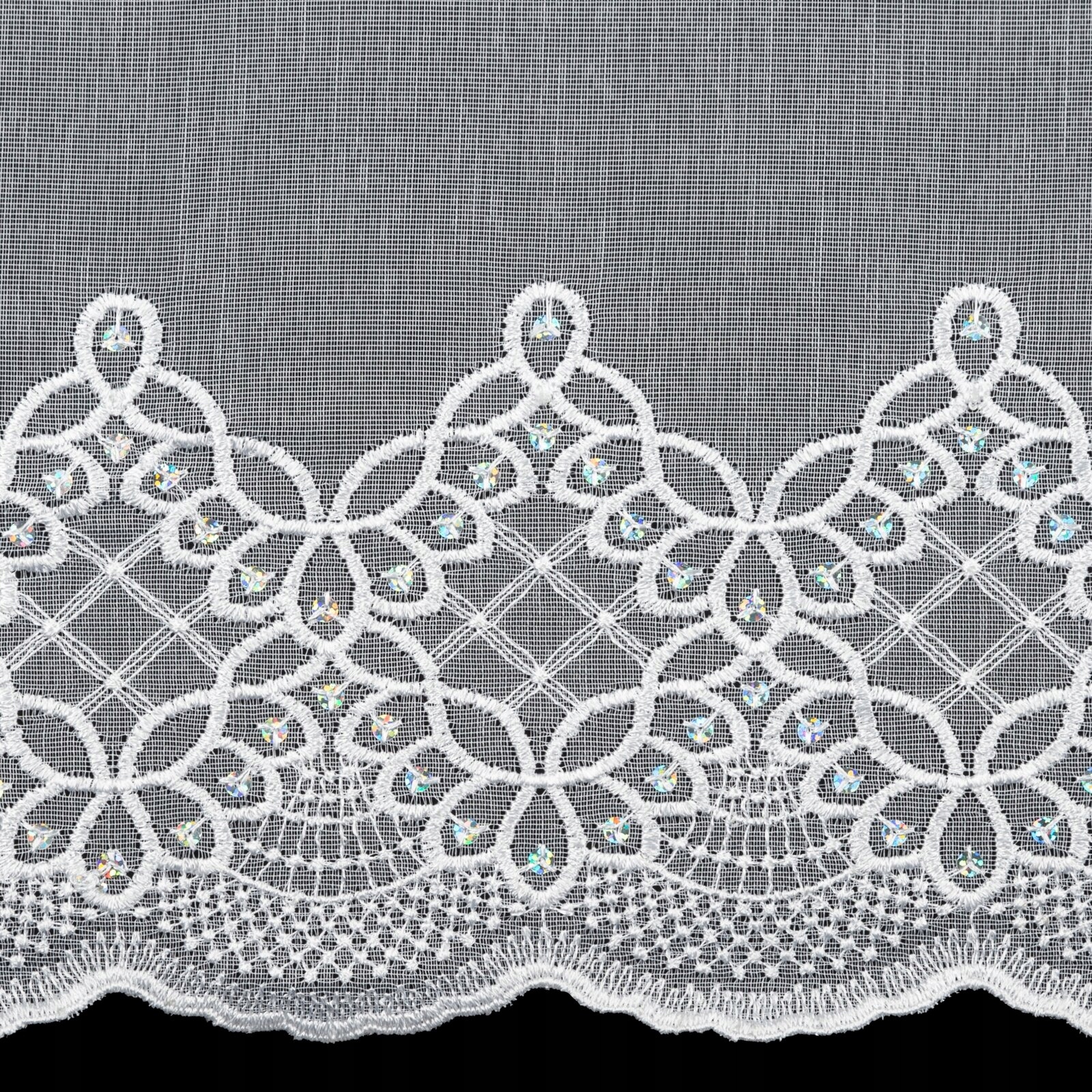 Firana z haftem u dołu, zdobiona cekinami. Można przypinać żabkami. U góry wszyta taśma marszcząca 5 cm.