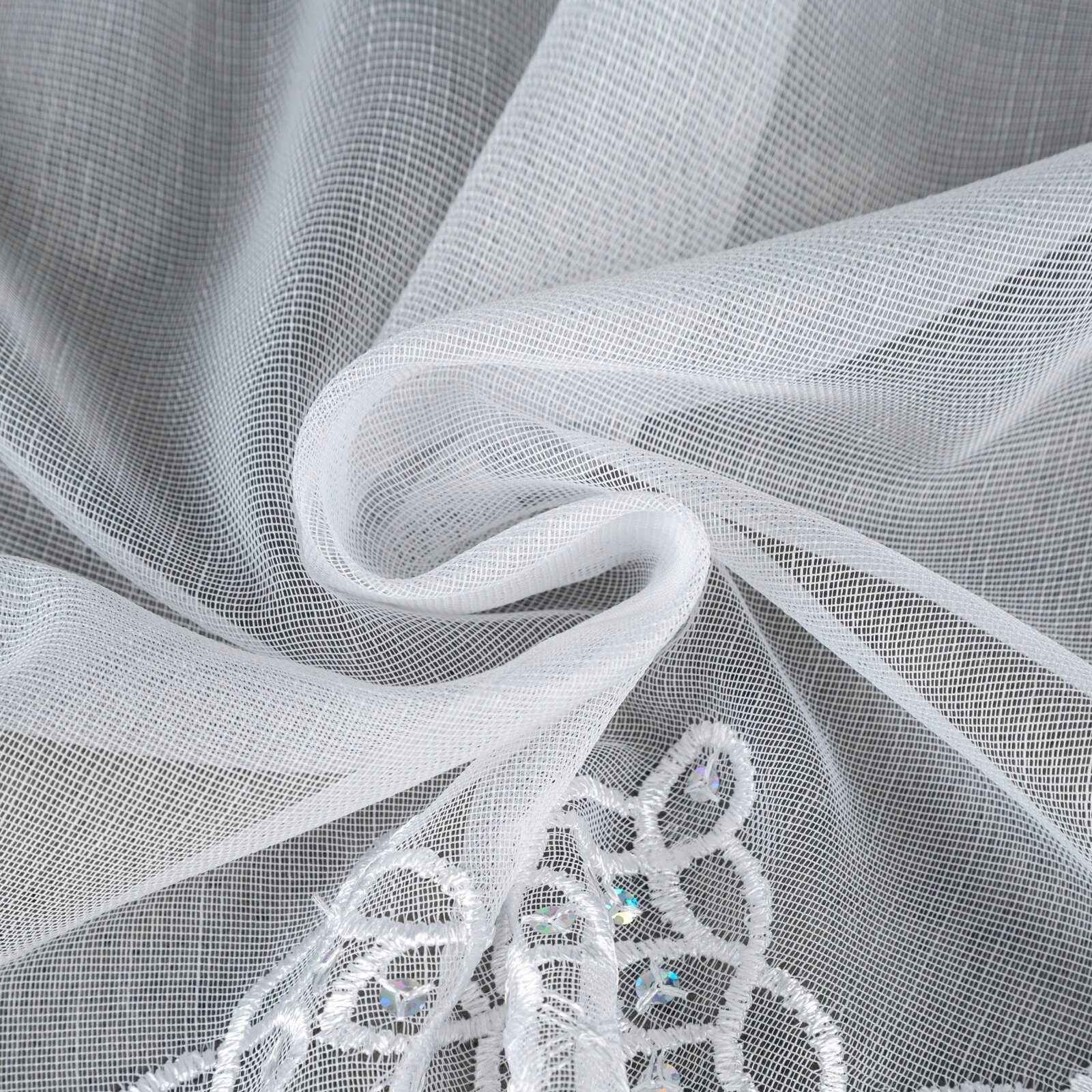 Firana z haftem u dołu, zdobiona cekinami. Można przypinać żabkami. U góry wszyta taśma marszcząca 5 cm.