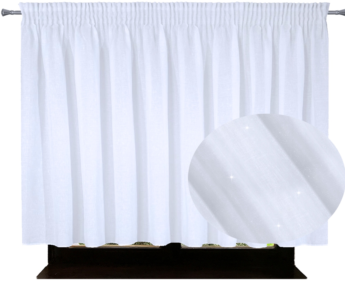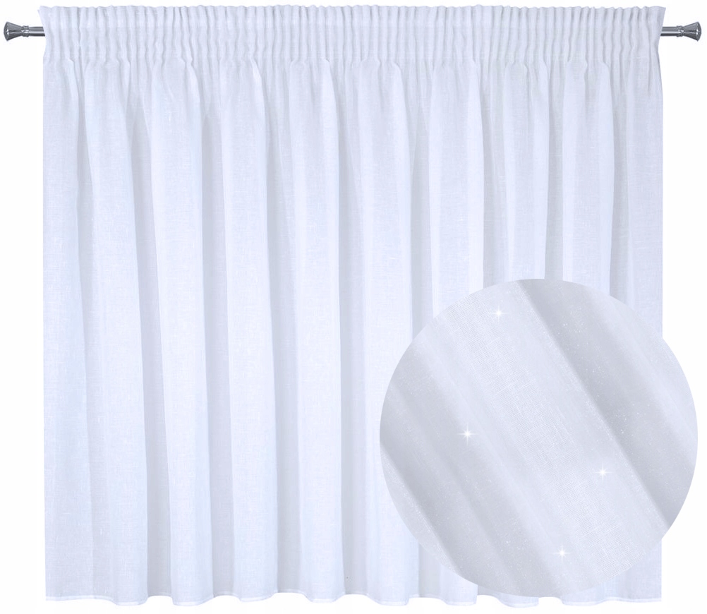 Delikatna firana w pięknym białym kolorze uszyta z tkaniny o strukturze drobnego deszczyku doskonale przepuszcza światło.