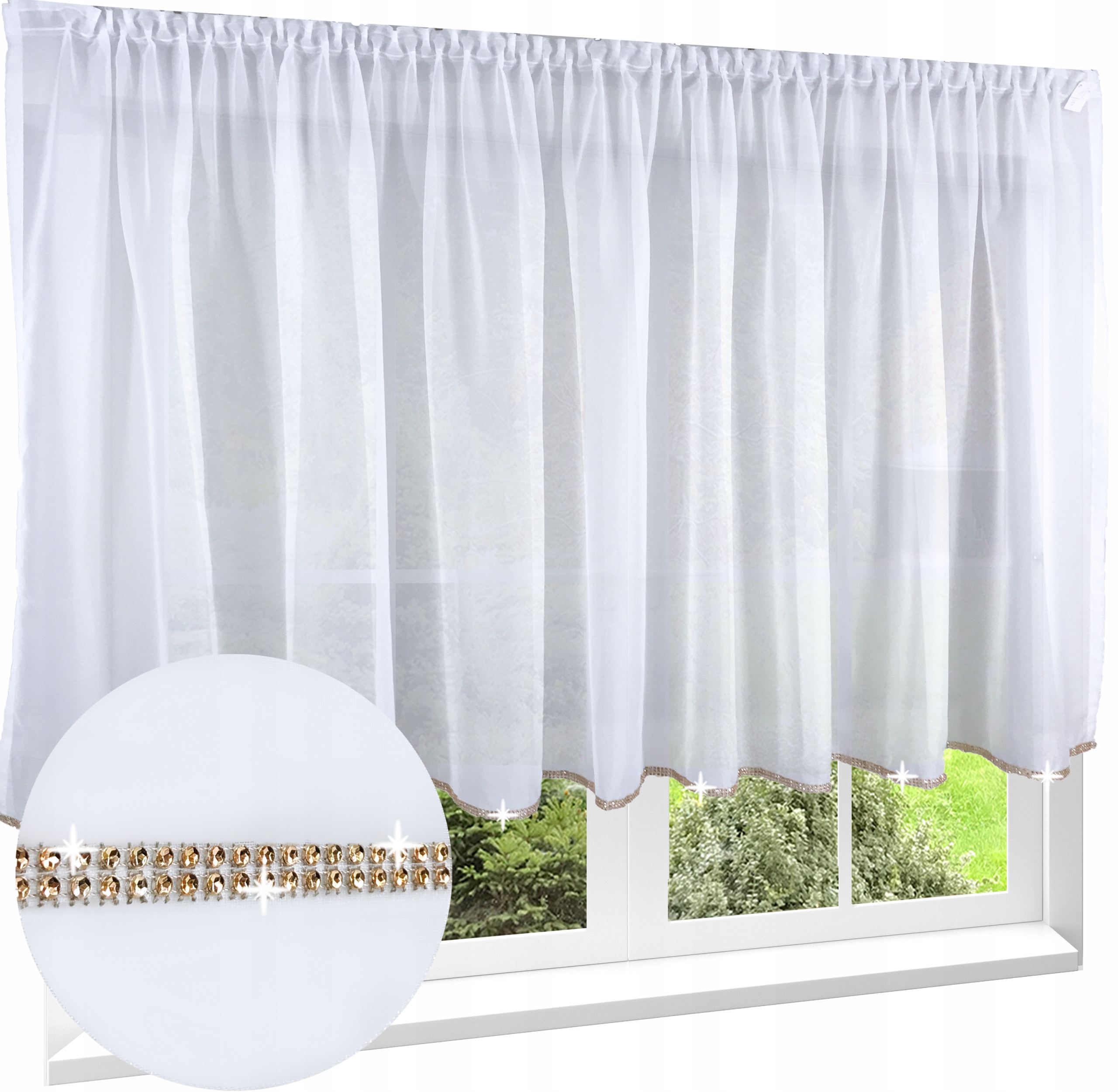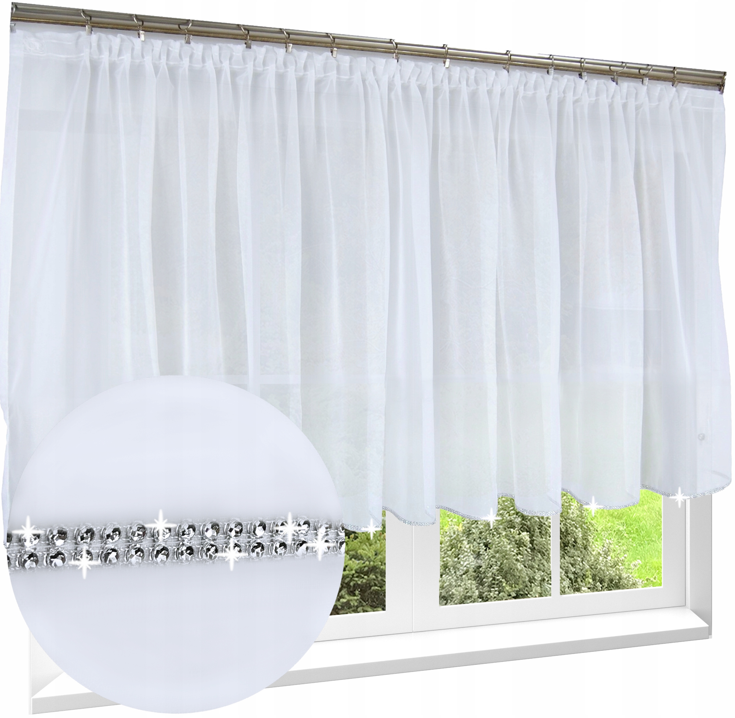 Firana wykonana z tkaniny w kolorze śnieżnobiałym. Można przypinać żabkami. U góry wszyta taśma marszcząca 5 cm.