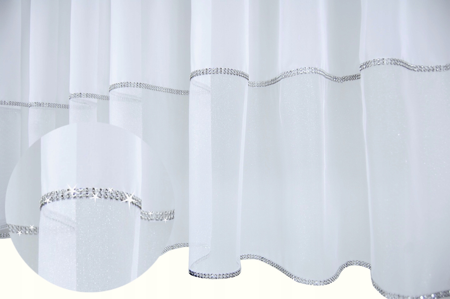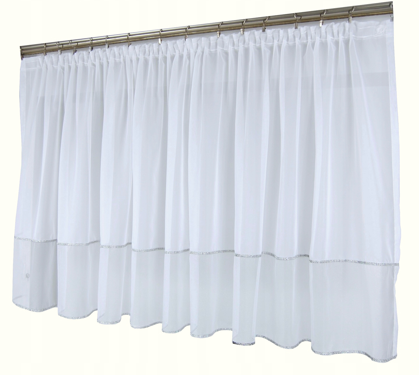 Firana wykonana z tkaniny w kolorze śnieżnobiałym. Można przypinać żabkami. U góry wszyta taśma marszcząca 5 cm.