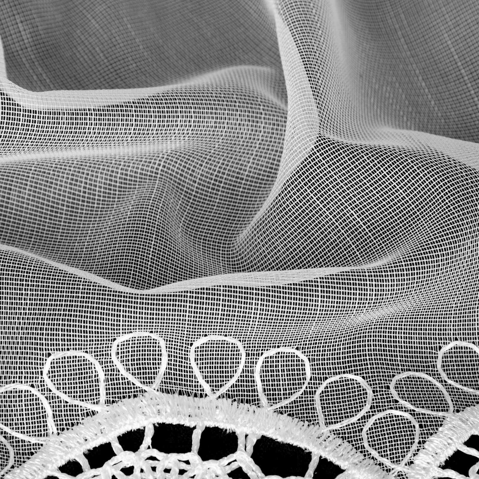 Przy zakupie potrzebnej ilości metrów należy wziąć pod uwagę zapas na zmarszczenie firany, które spowoduje eleganckie układanie – proponujemy zakupić dwukrotność szerokości karnisza.