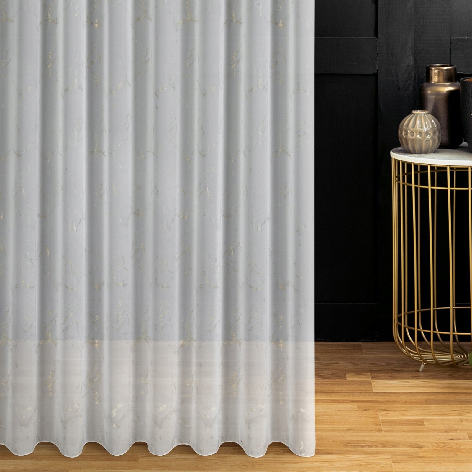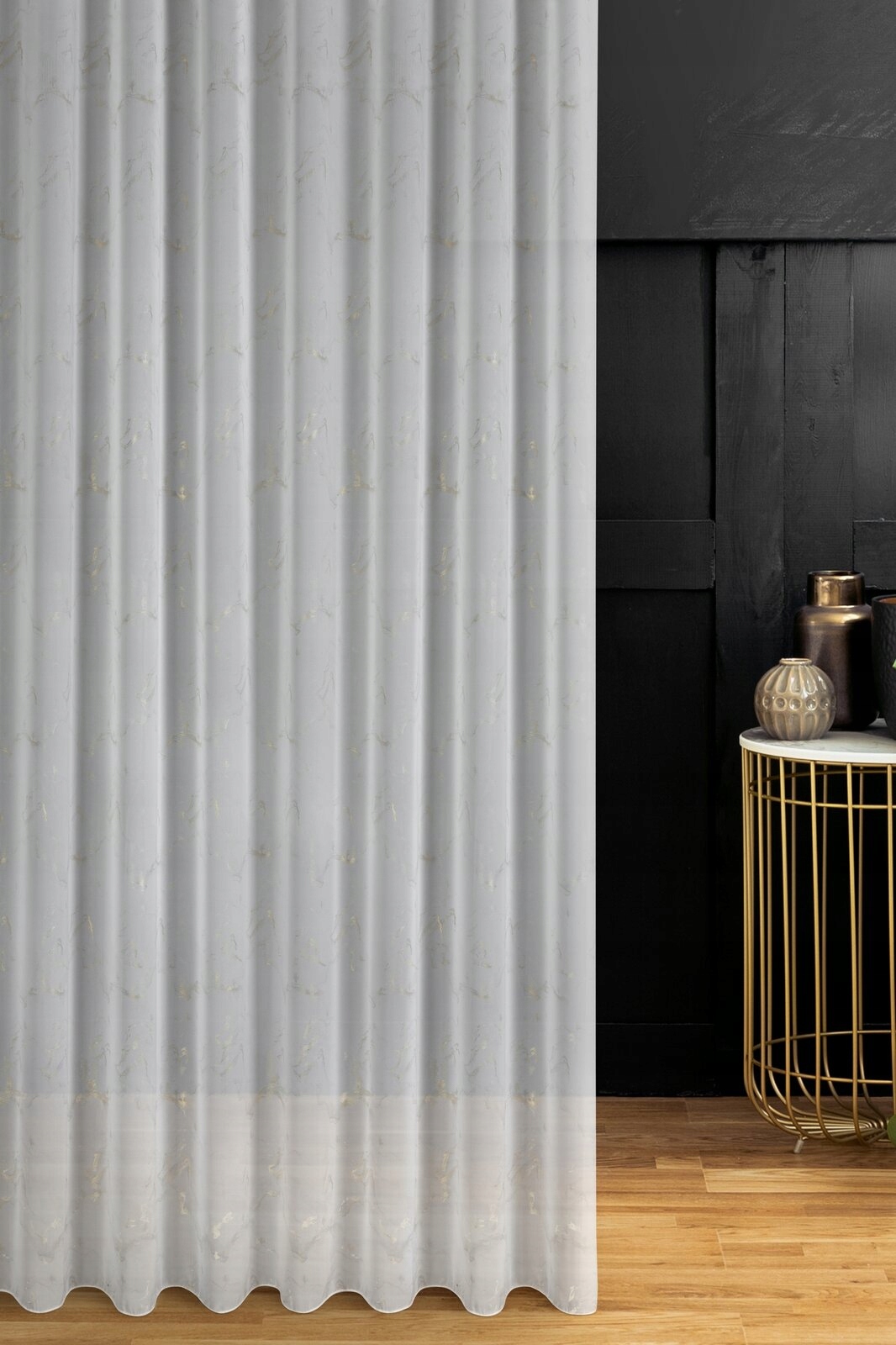 Firana wykonana z miękkiej lejącej tkaniny, zdobiona na całej powierzchni nieregularnym szampańskim nadrukiem.