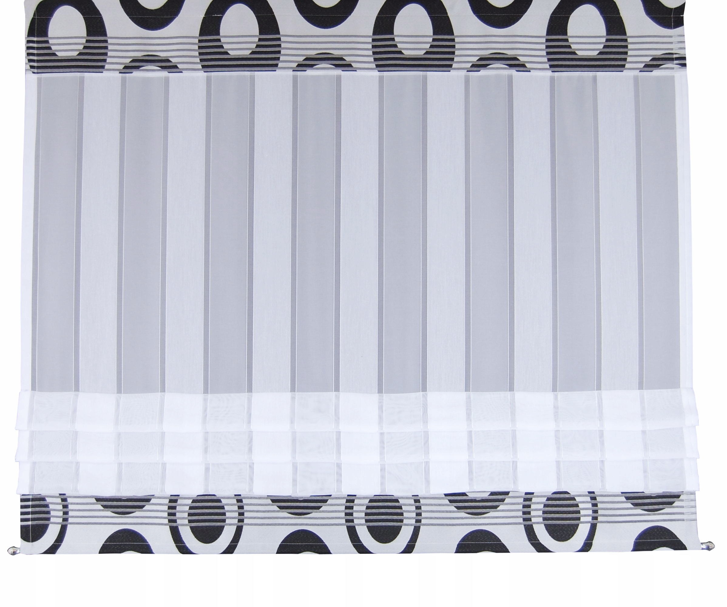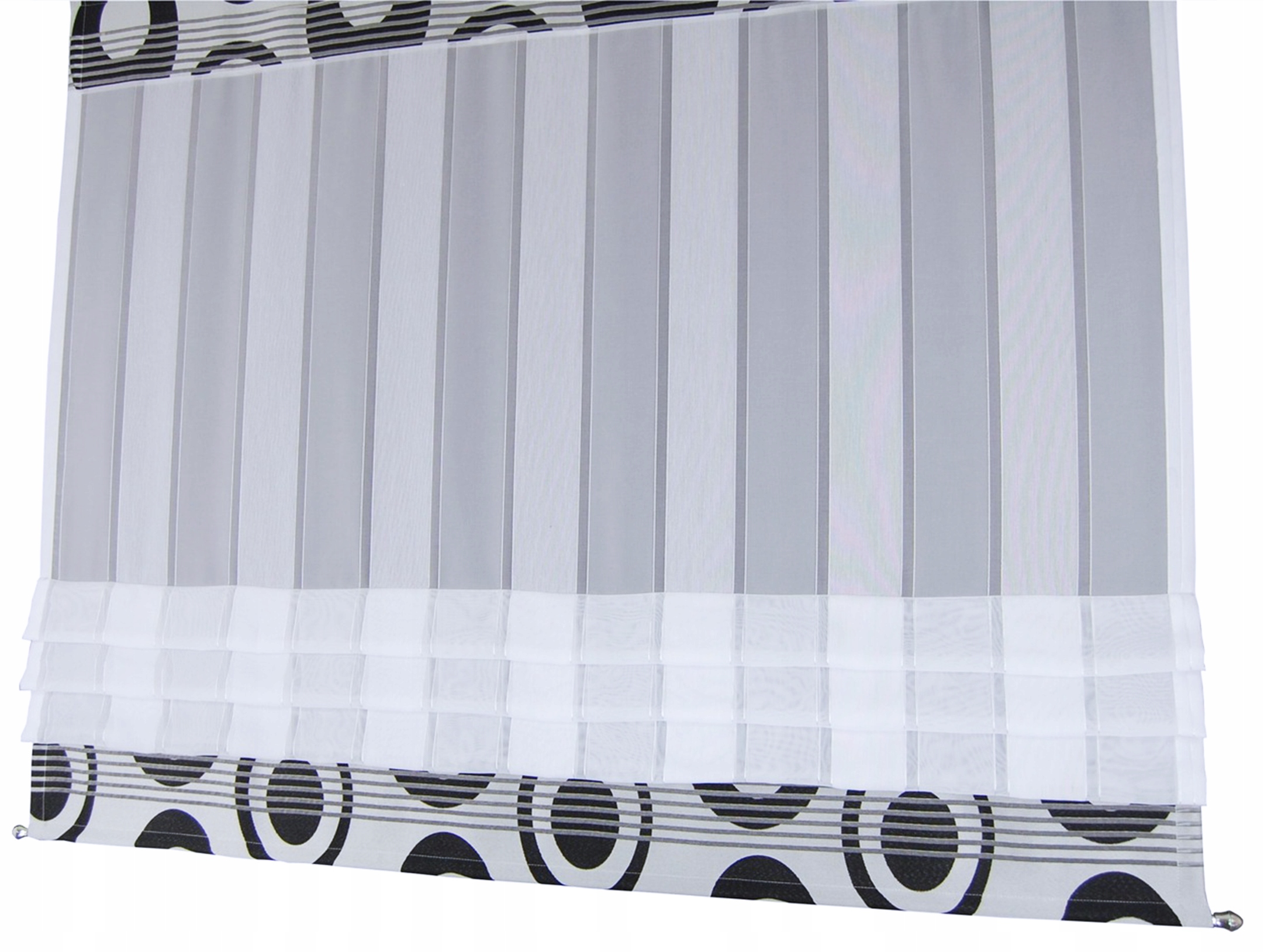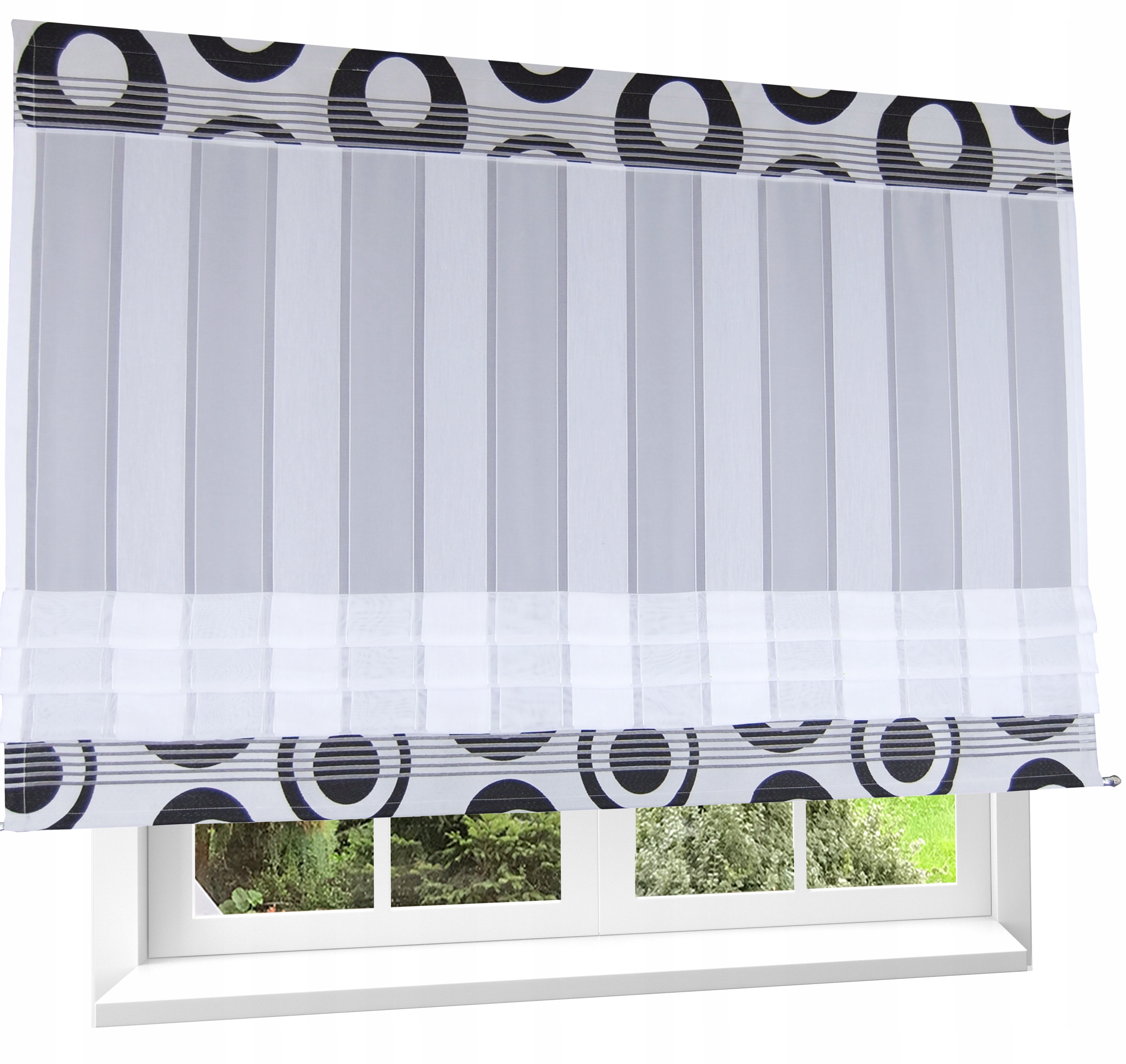 Przedmiotem oferty jest roleta. U góry wszyta taśma 5 cm, można przypinać żabkami lub wsuwać na tunel. Na dole tunel na obciążnik. Obciążnik nie jest przedmiotem aukcji.