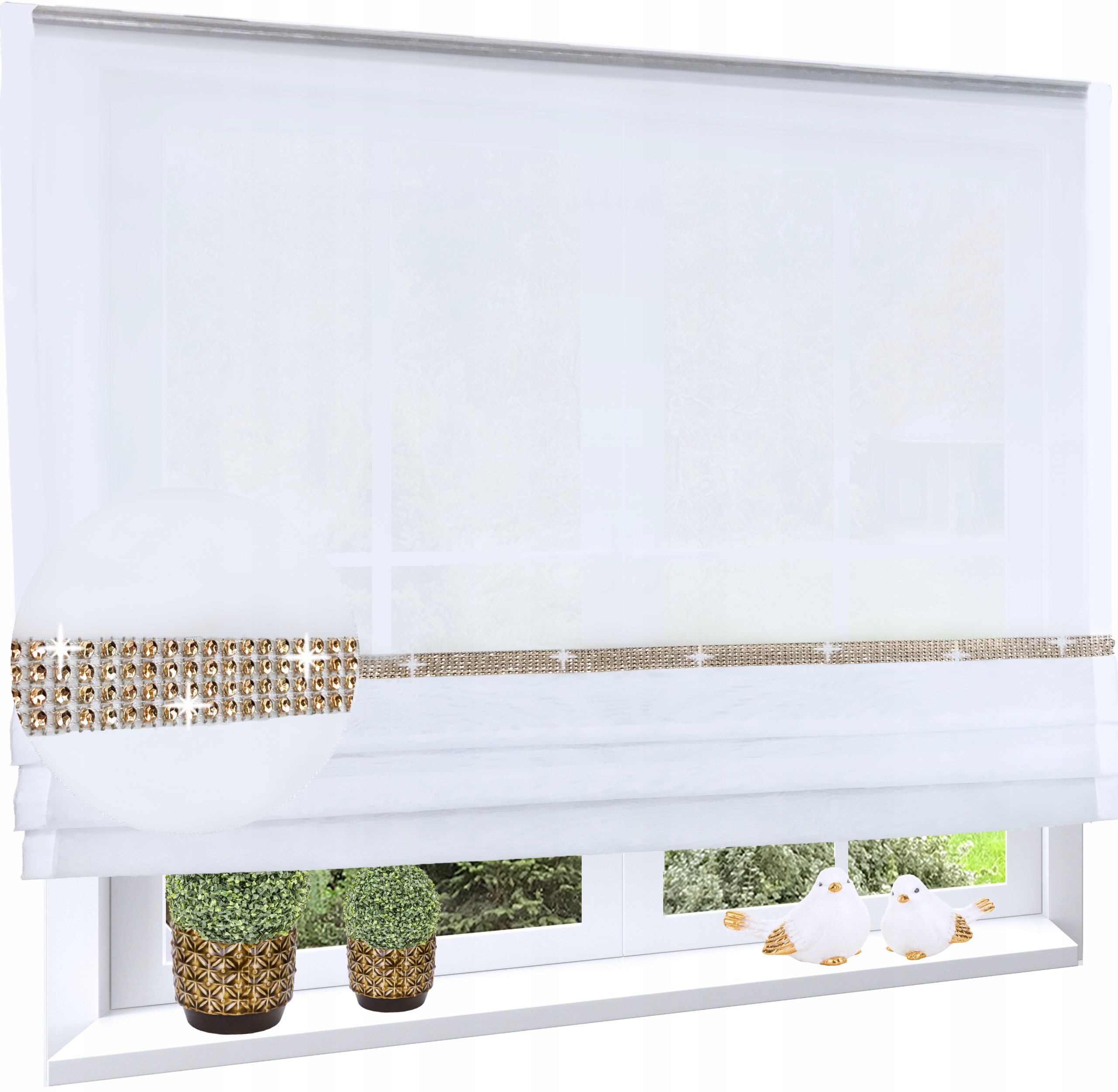 Roletka wykonana z tkaniny w kolorze śnieżnobiałym. U góry wszyta taśma 5 cm. Można przypinać żabkami lub wsuwać na tunel.