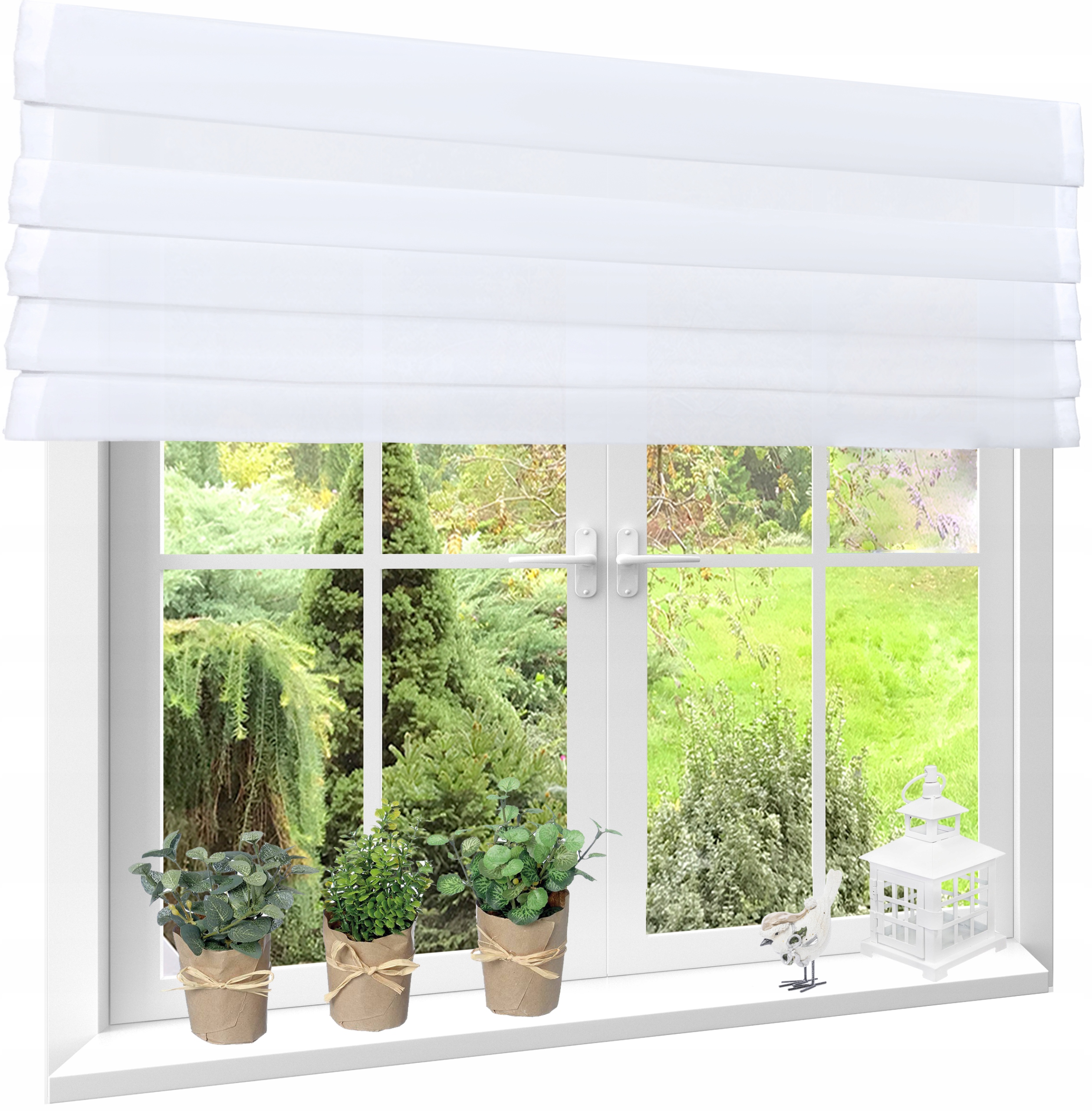 Roletka wykonana z tkaniny w kolorze śnieżnobiałym. U góry wszyta taśma 5 cm. Można przypinać żabkami lub wsuwać na tunel.