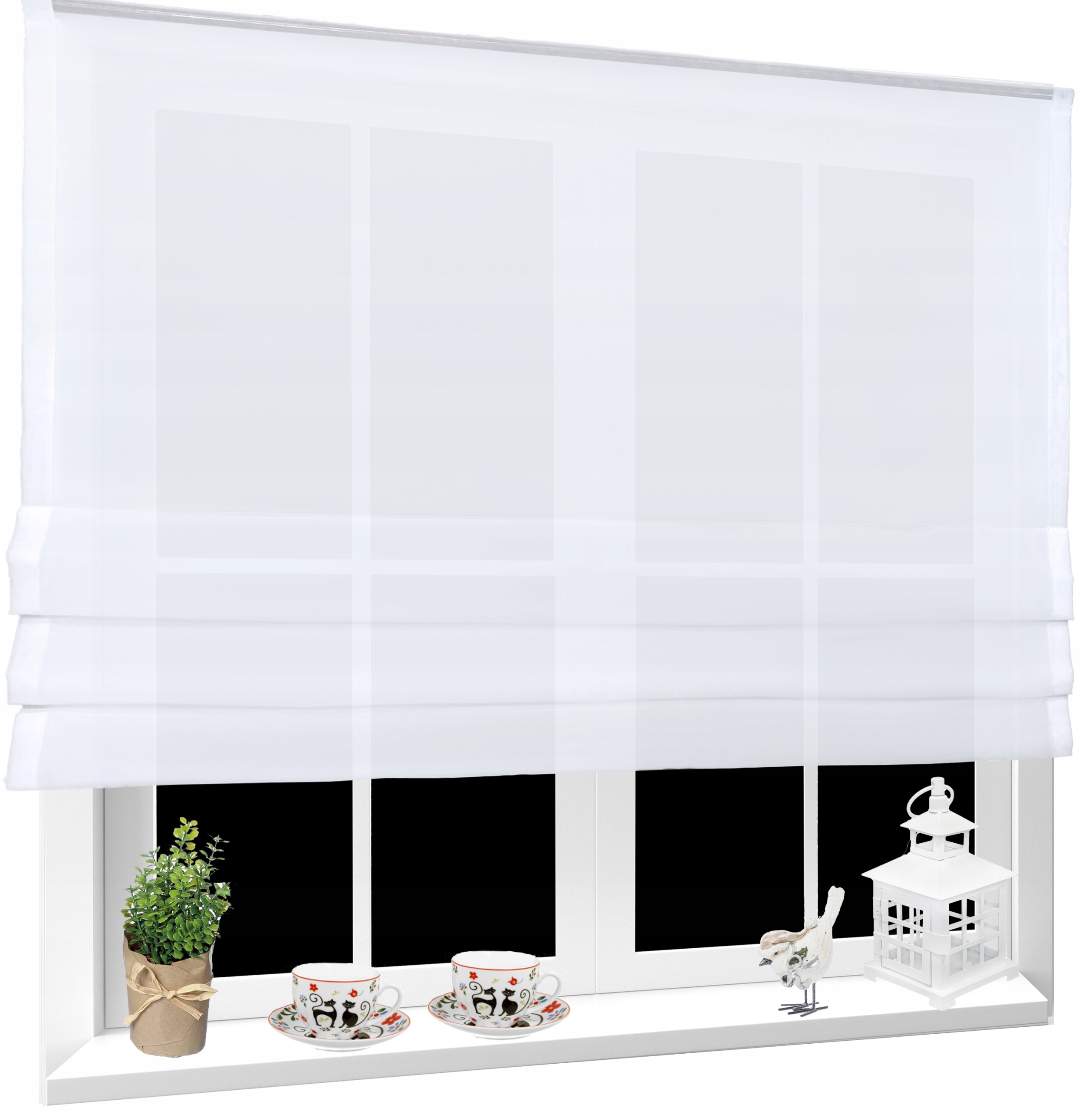 Roletka wykonana z tkaniny w kolorze śnieżnobiałym. U góry wszyta taśma 5 cm. Można przypinać żabkami lub wsuwać na tunel.