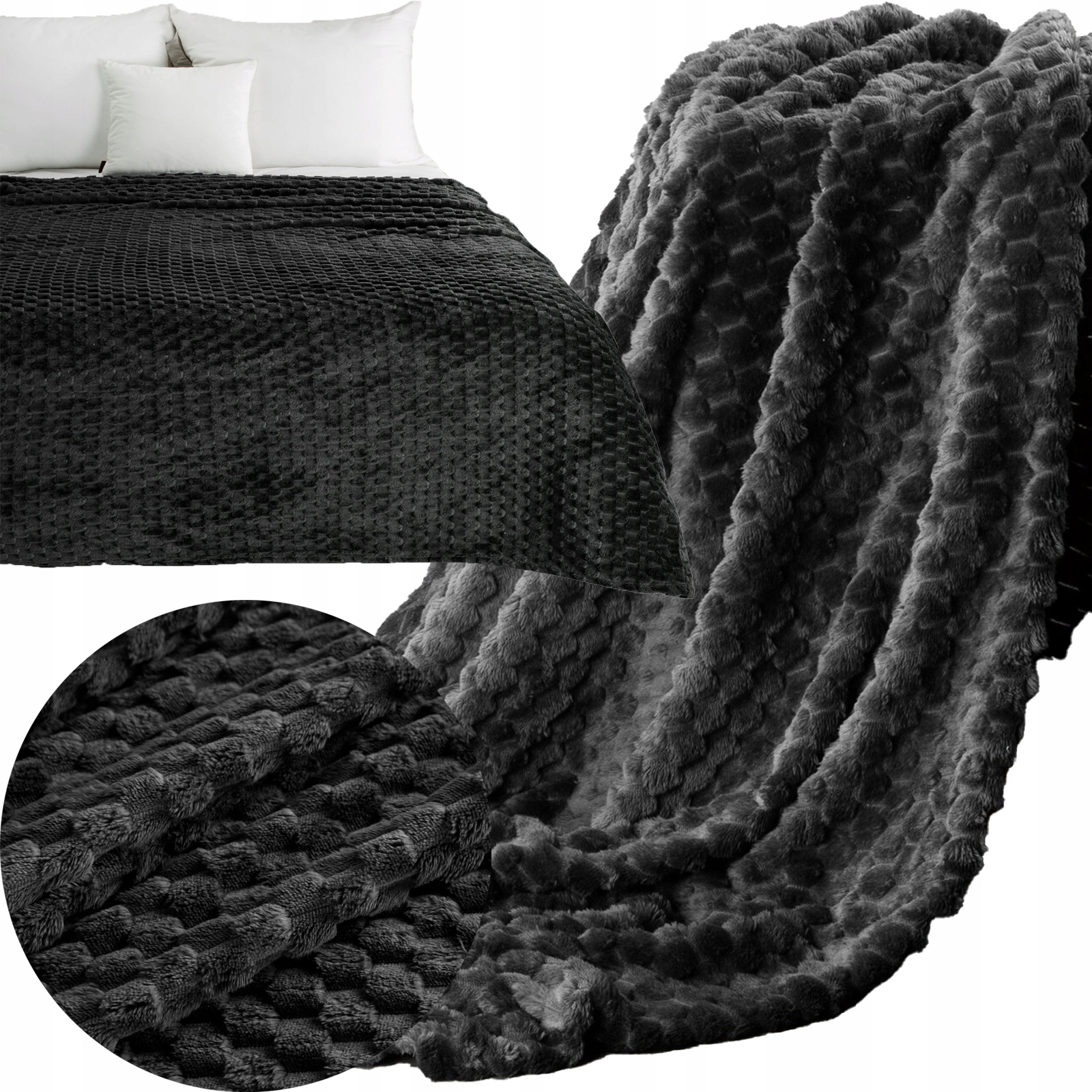 Koc narzuta 200 cm x 220 cm bardzo miękki w dotyku z efektem 3d czarny