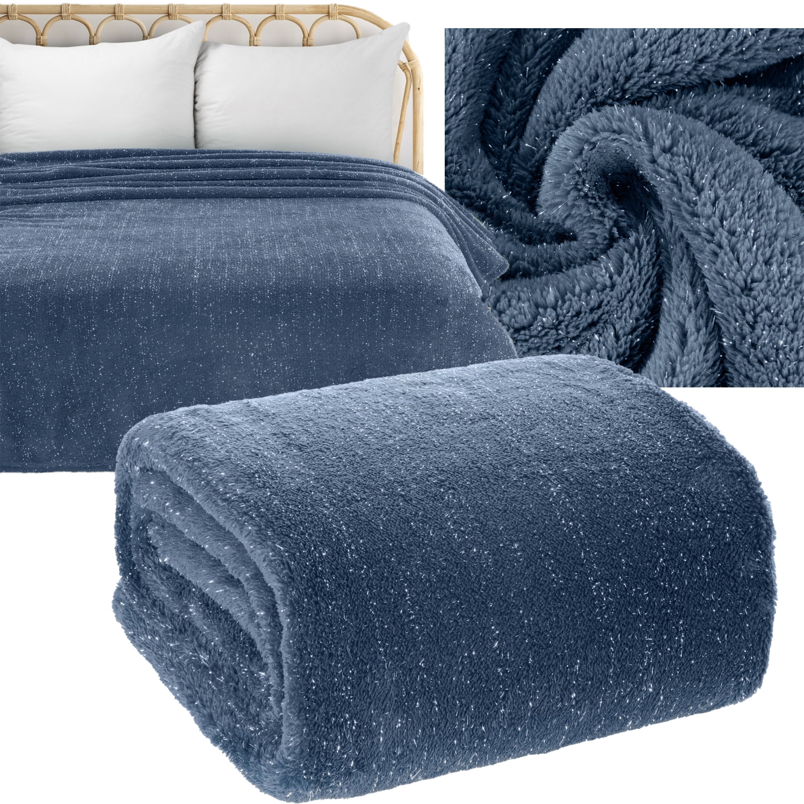 Klasyczny koc z przyjemnego w dotyku włókna w technologii mikroflano. Jednobarwna, puszysta faktura przetykana srebrną nitką.