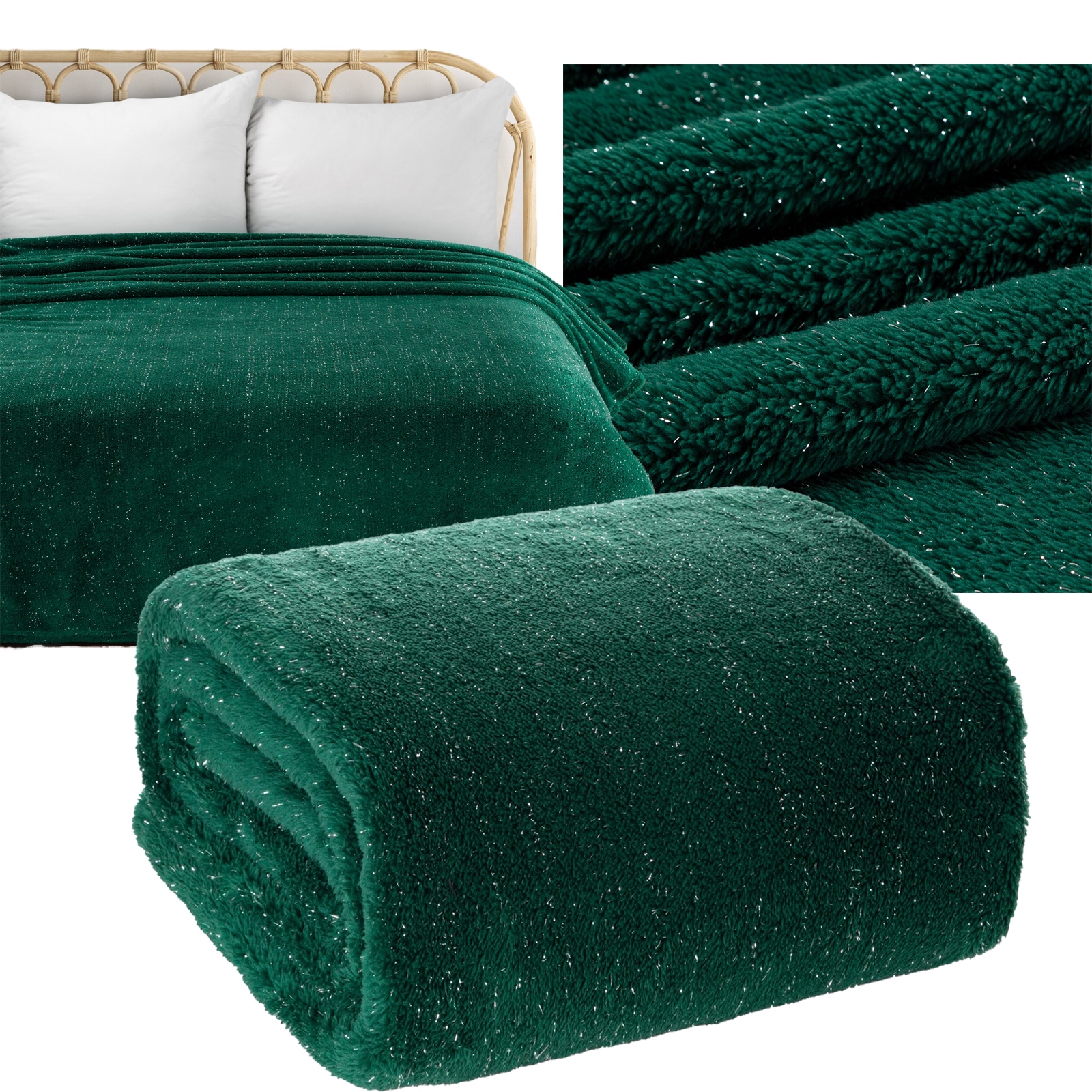 Klasyczny koc z przyjemnego w dotyku włókna w technologii mikroflano. Jednobarwna, puszysta faktura przetykana srebrną nitką.