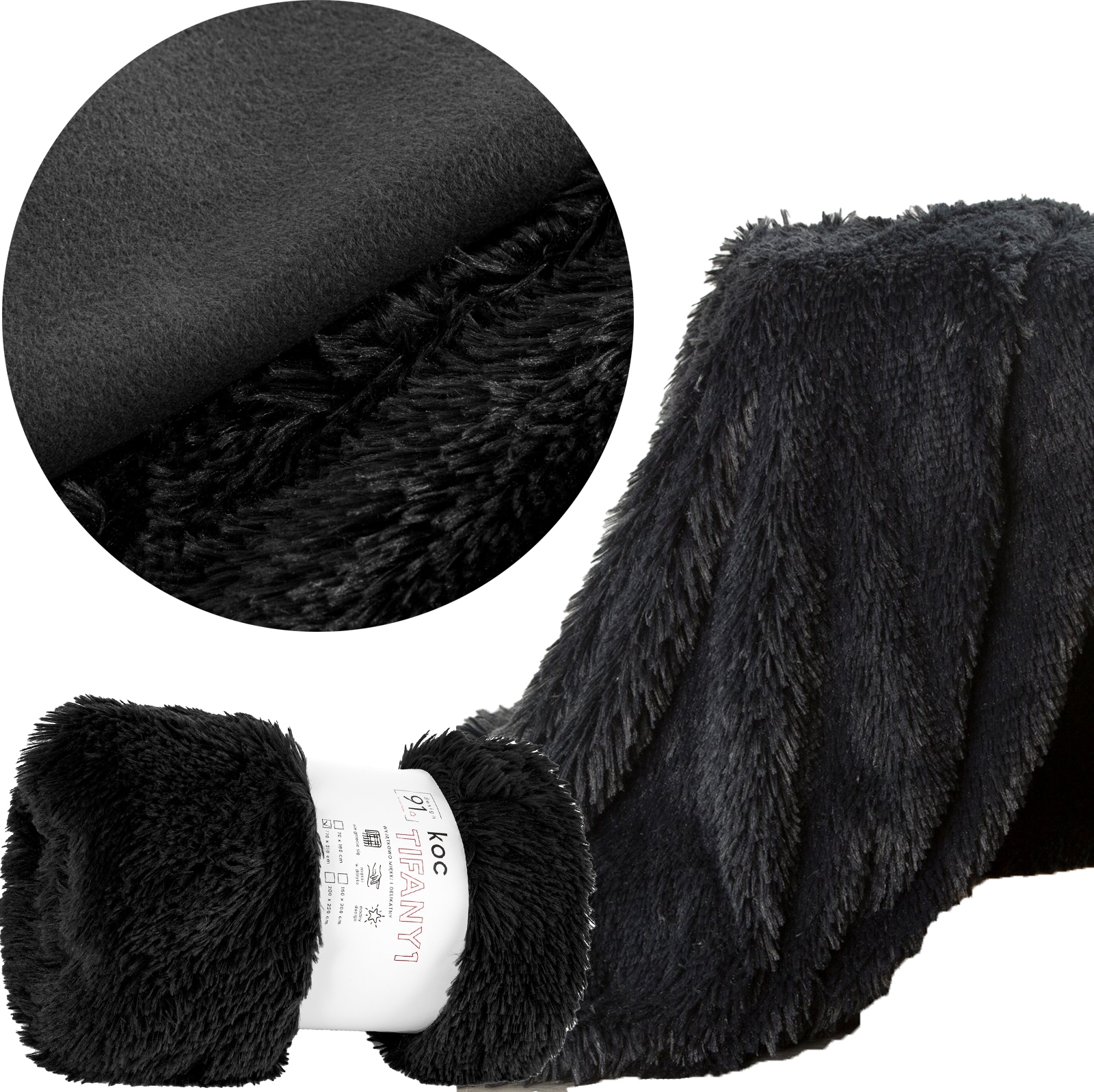Czarny, miękki i przyjemny w dotyku koc o strukturze futra, rozmiar 70 cm x 160 cm