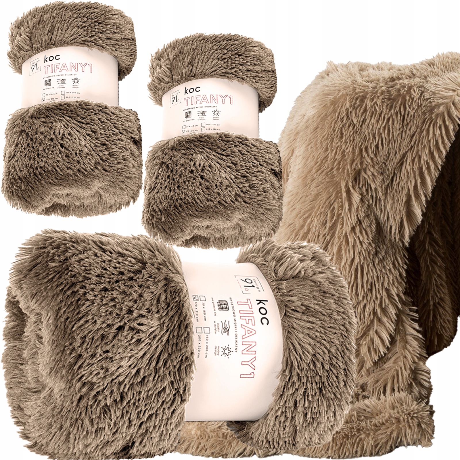 Koc włochacz futrzak pled narzuta na łóżko 170×210 + 2x 70×160 beżowy