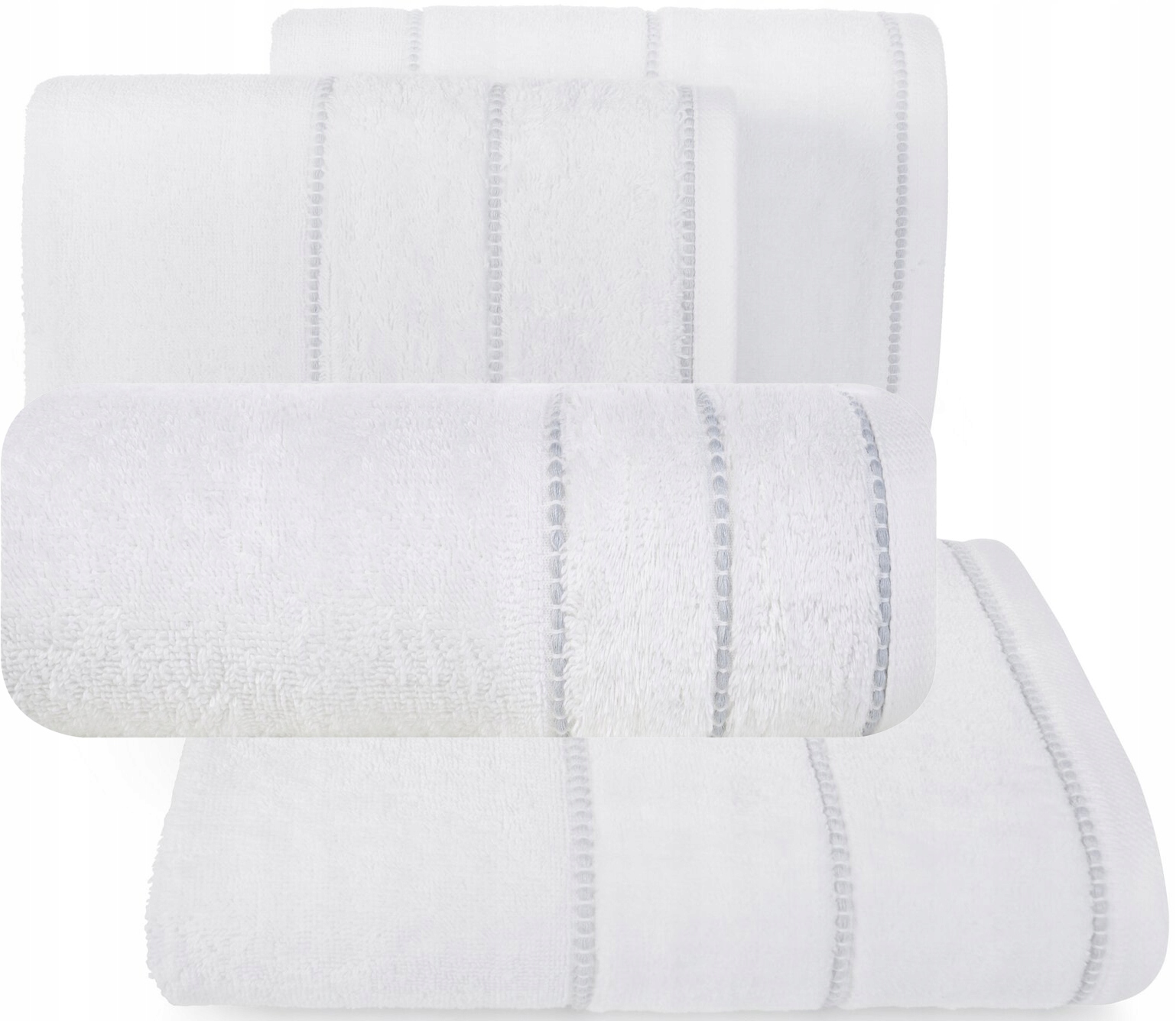 Klasyczny ręcznik kąpielowy z chłonnej tkaniny bawełnianej o splocie frotte. Ręcznik z ozdobną welurową bordiurą w pasy.