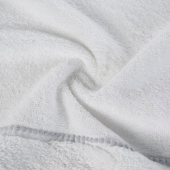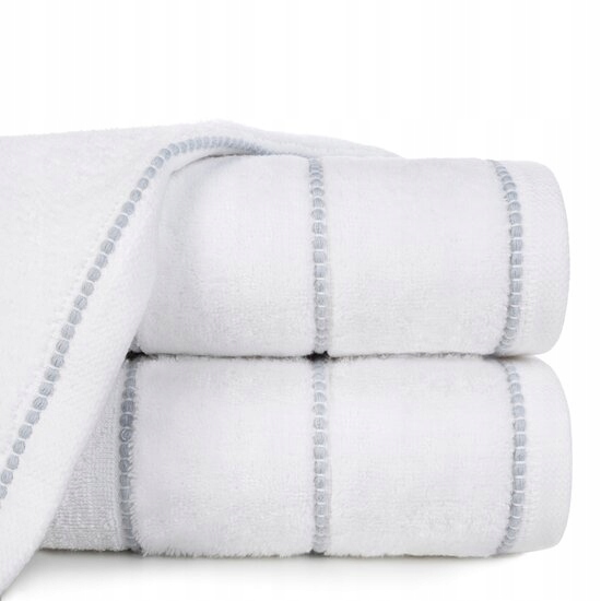 Klasyczny ręcznik kąpielowy z chłonnej tkaniny bawełnianej o splocie frotte. Ręcznik z ozdobną welurową bordiurą w pasy.