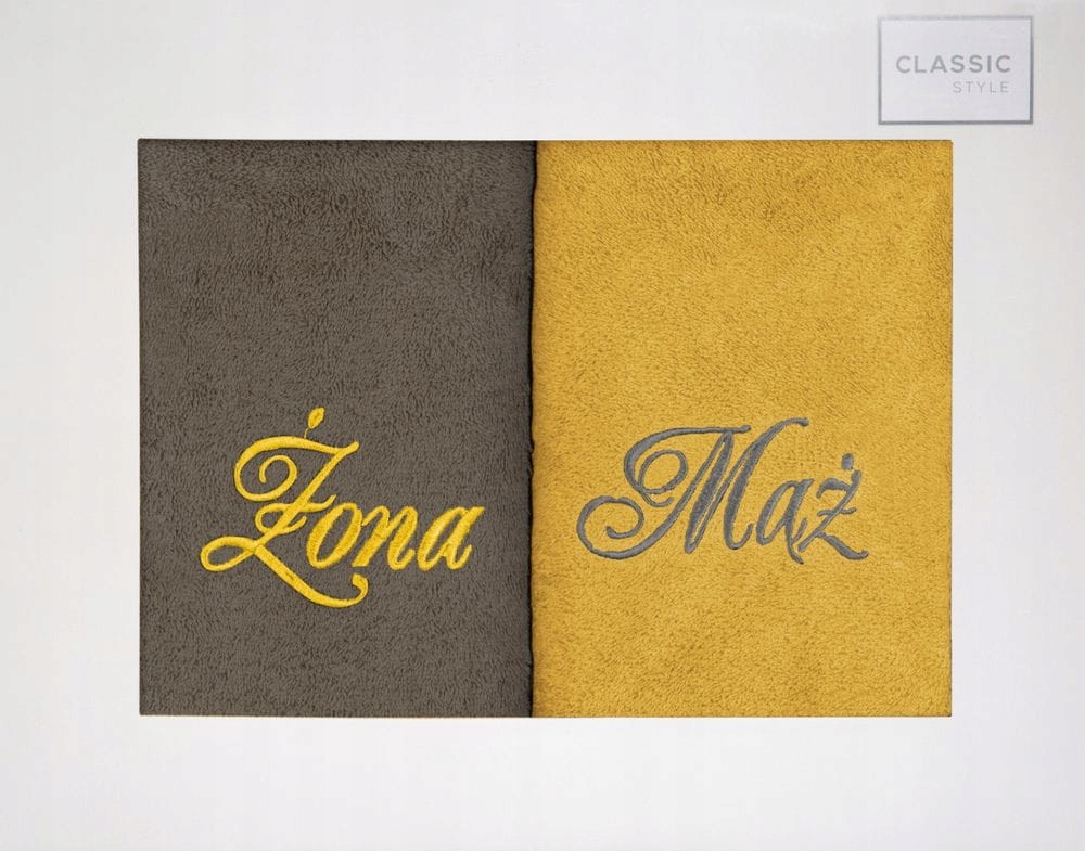 W skład kompletu wchodzi ręcznik w kolorze stalowym i musztardowym. Ozdobione są haftem : „Mąż„, „Żona„.