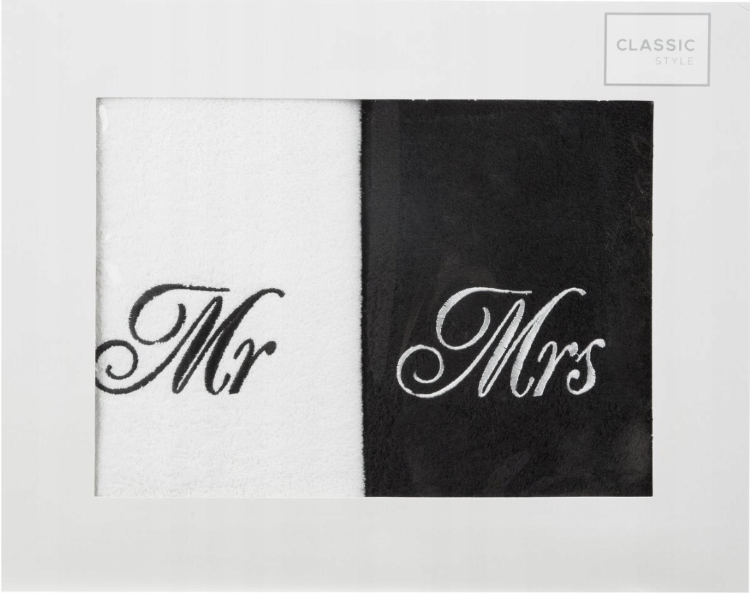 W skład kompletu wchodzi ręcznik w kolorze stalowym i musztardowym. Ozdobione są haftem : „Mr„, „Mrs„.