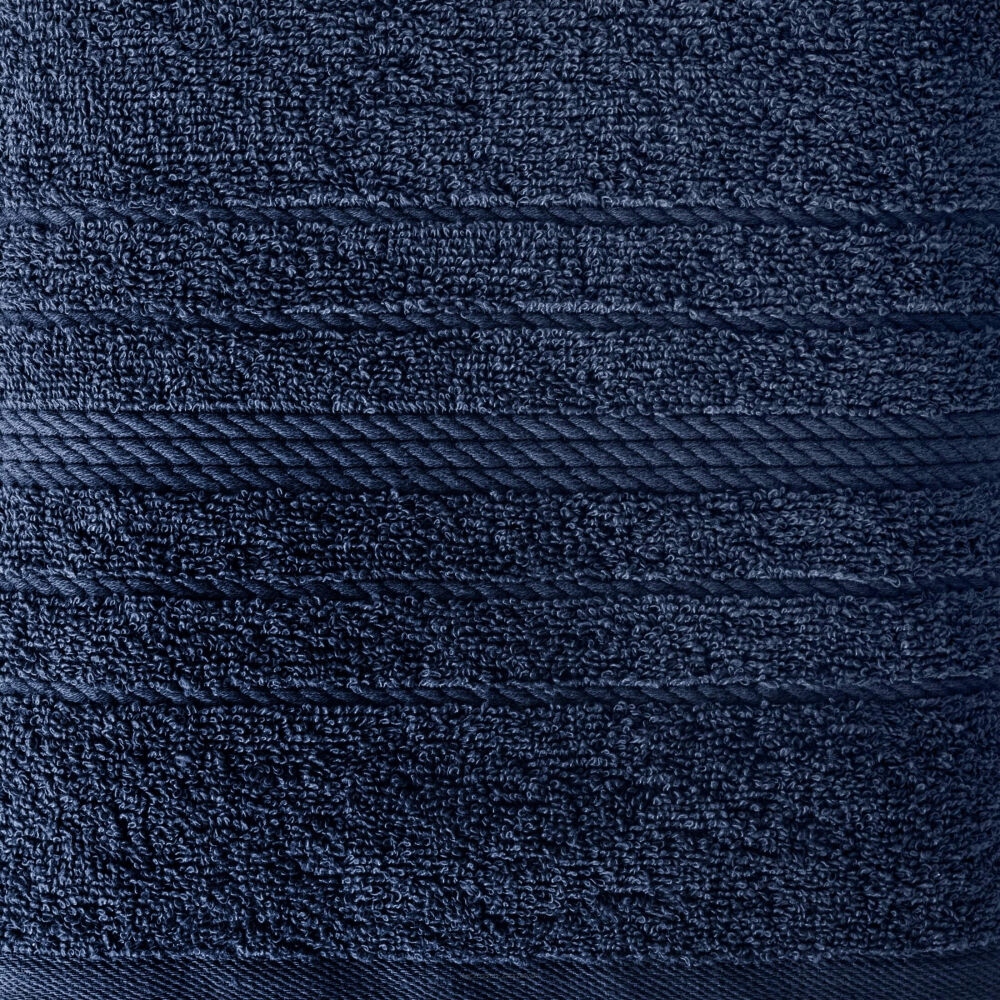 Klasyczny ręcznik kąpielowy z chłonnej tkaniny bawełnianej o splocie frotte. Ręcznik z ozdobną welurową bordiurą w pasy.