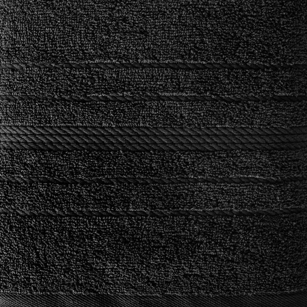 Klasyczny ręcznik kąpielowy z chłonnej tkaniny bawełnianej o splocie frotte. Ręcznik z ozdobną welurową bordiurą w pasy.