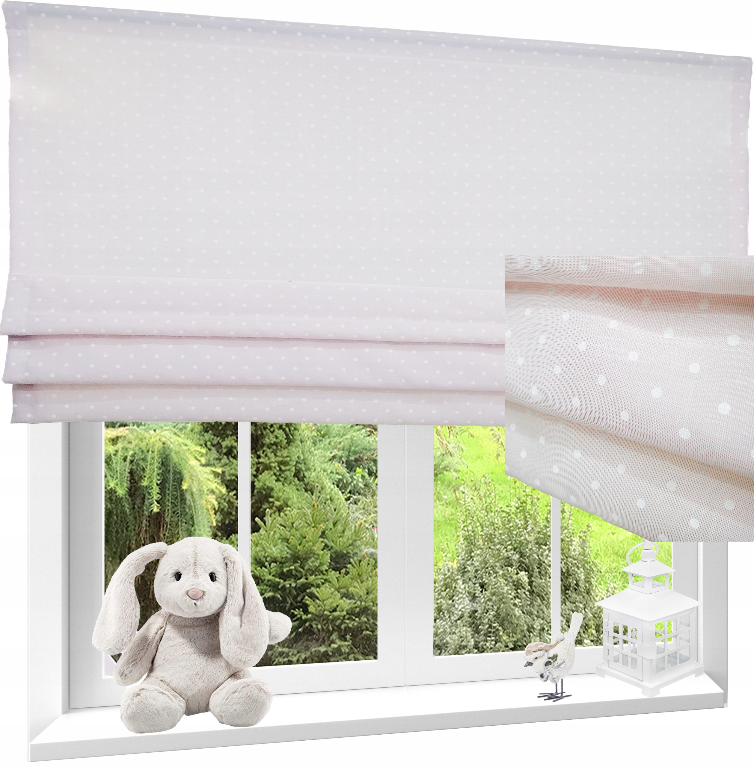 Roletka wykonana z różowej tkaniny w kropki. U góry wszyta taśma 5 cm. Można przypinać żabkami lub wsuwać na tunel.