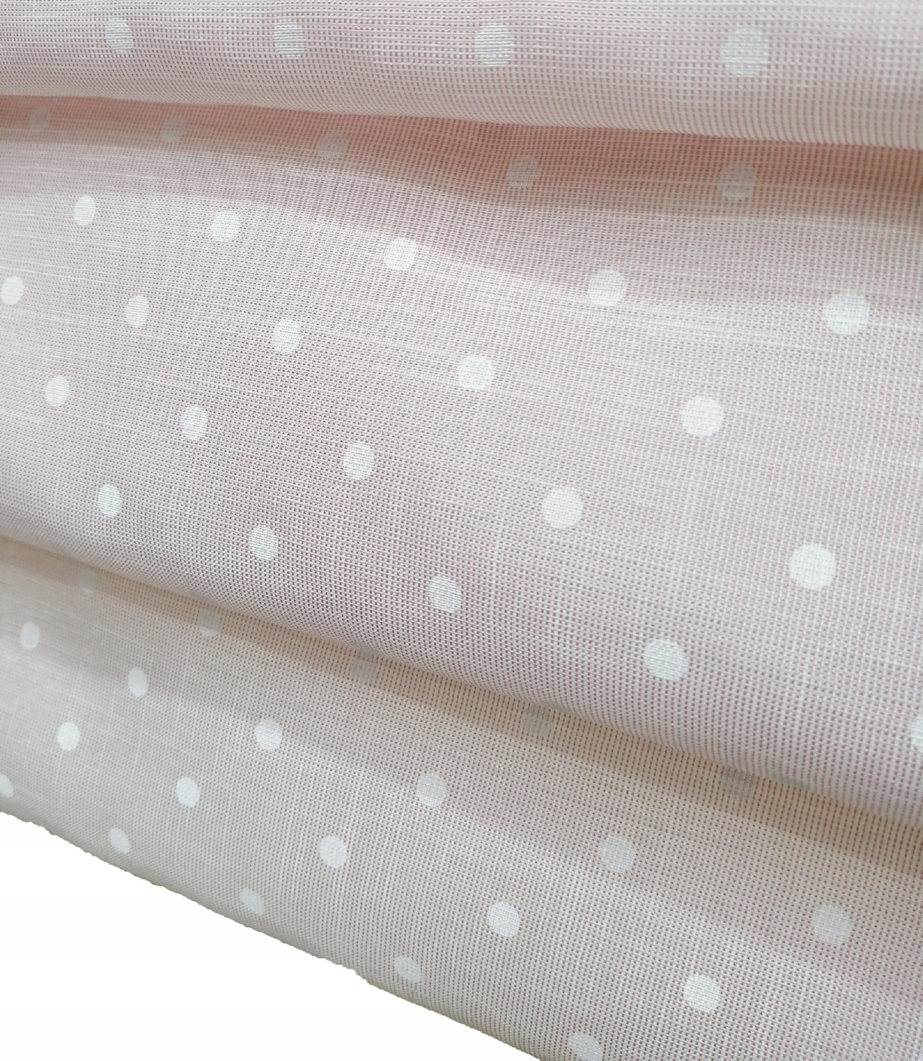 Roletka wykonana z różowej tkaniny w kropki. U góry wszyta taśma 5 cm. Można przypinać żabkami lub wsuwać na tunel.