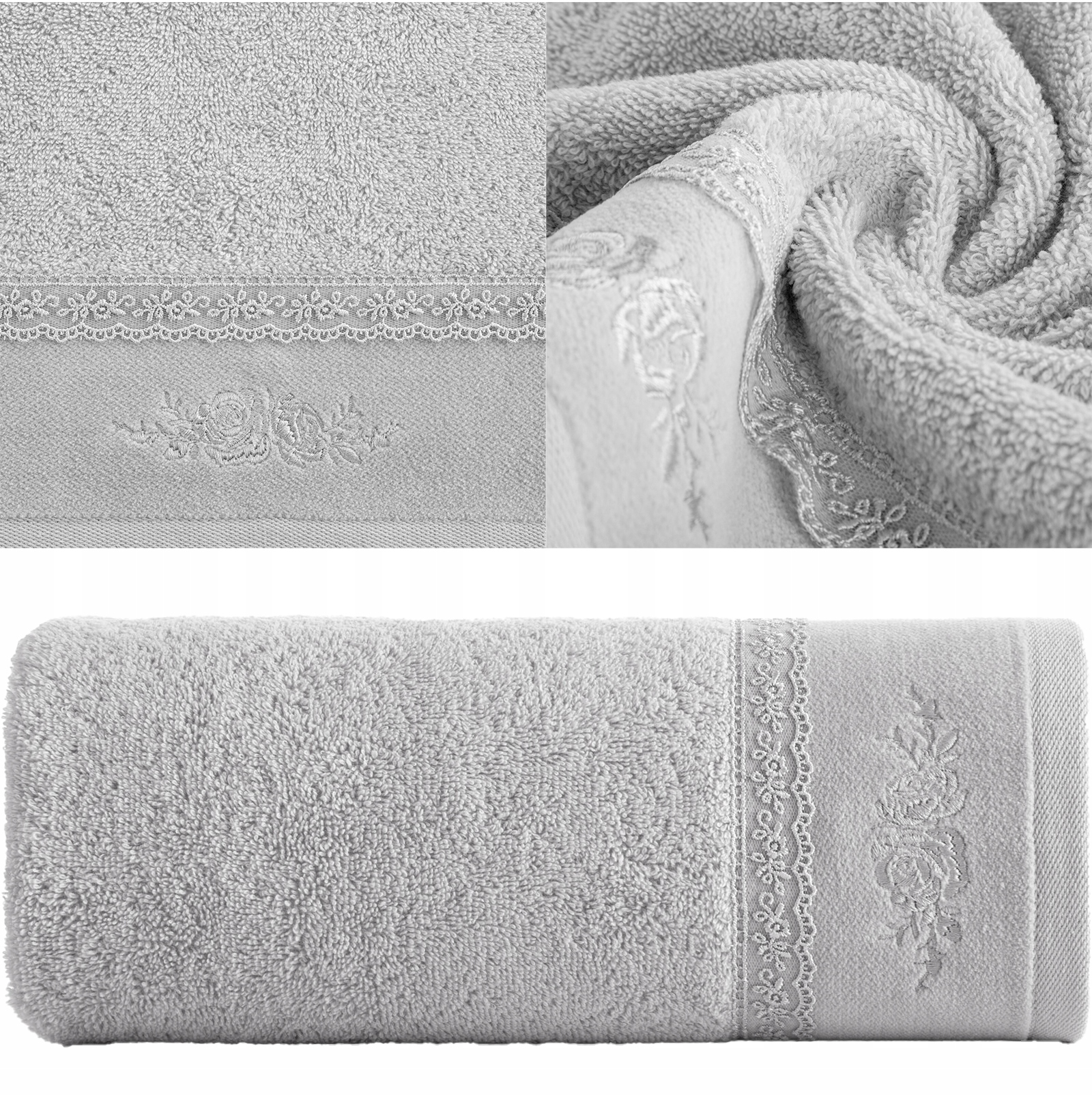 Piękny ręcznik kąpielowy z miękkiej i chłonnej bawełny frotte zdobiony na bordiurze aplikacją w formie serduszek wypełnionych różyczkami. Doskonały na prezent.