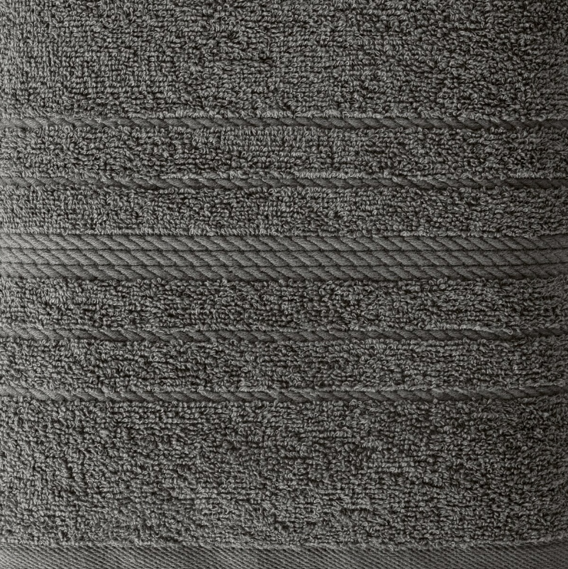 Klasyczny ręcznik kąpielowy z chłonnej tkaniny bawełnianej o splocie frotte. Ręcznik z ozdobną welurową bordiurą w pasy.