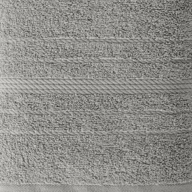 Klasyczny ręcznik kąpielowy z chłonnej tkaniny bawełnianej o splocie frotte. Ręcznik z ozdobną welurową bordiurą w pasy.