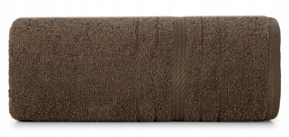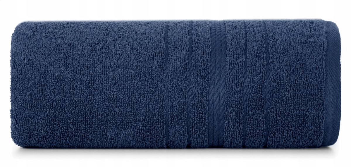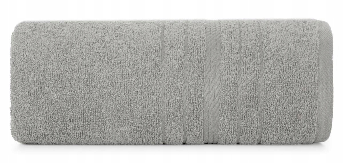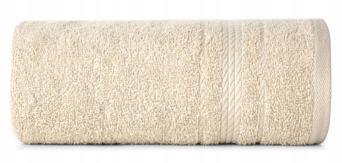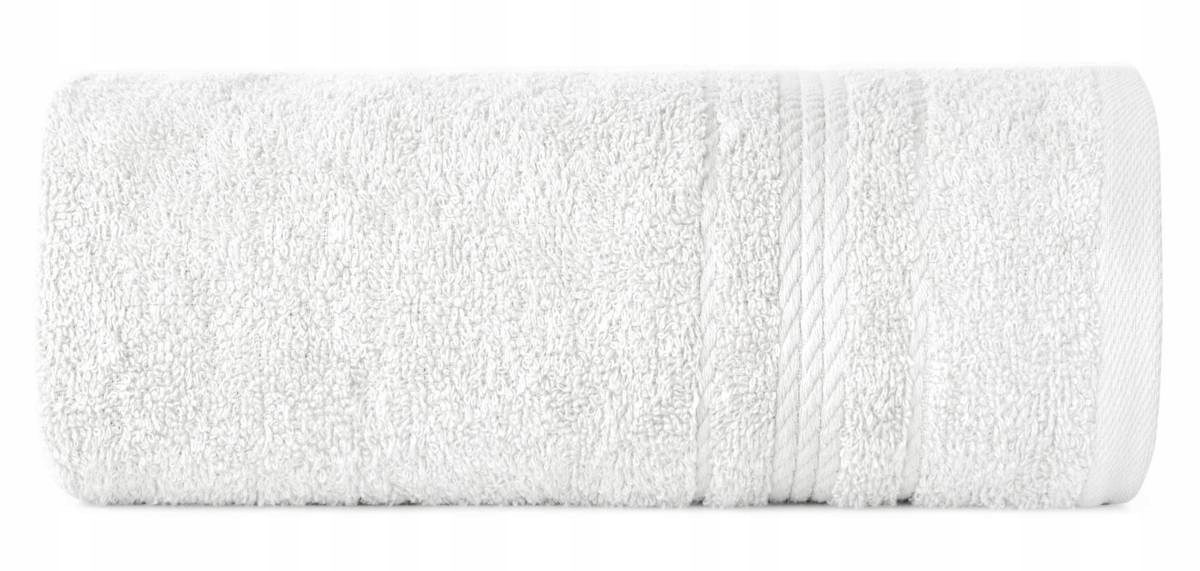 Klasyczny ręcznik kąpielowy z chłonnej tkaniny bawełnianej o splocie frotte. Ręcznik z ozdobną welurową bordiurą w pasy.