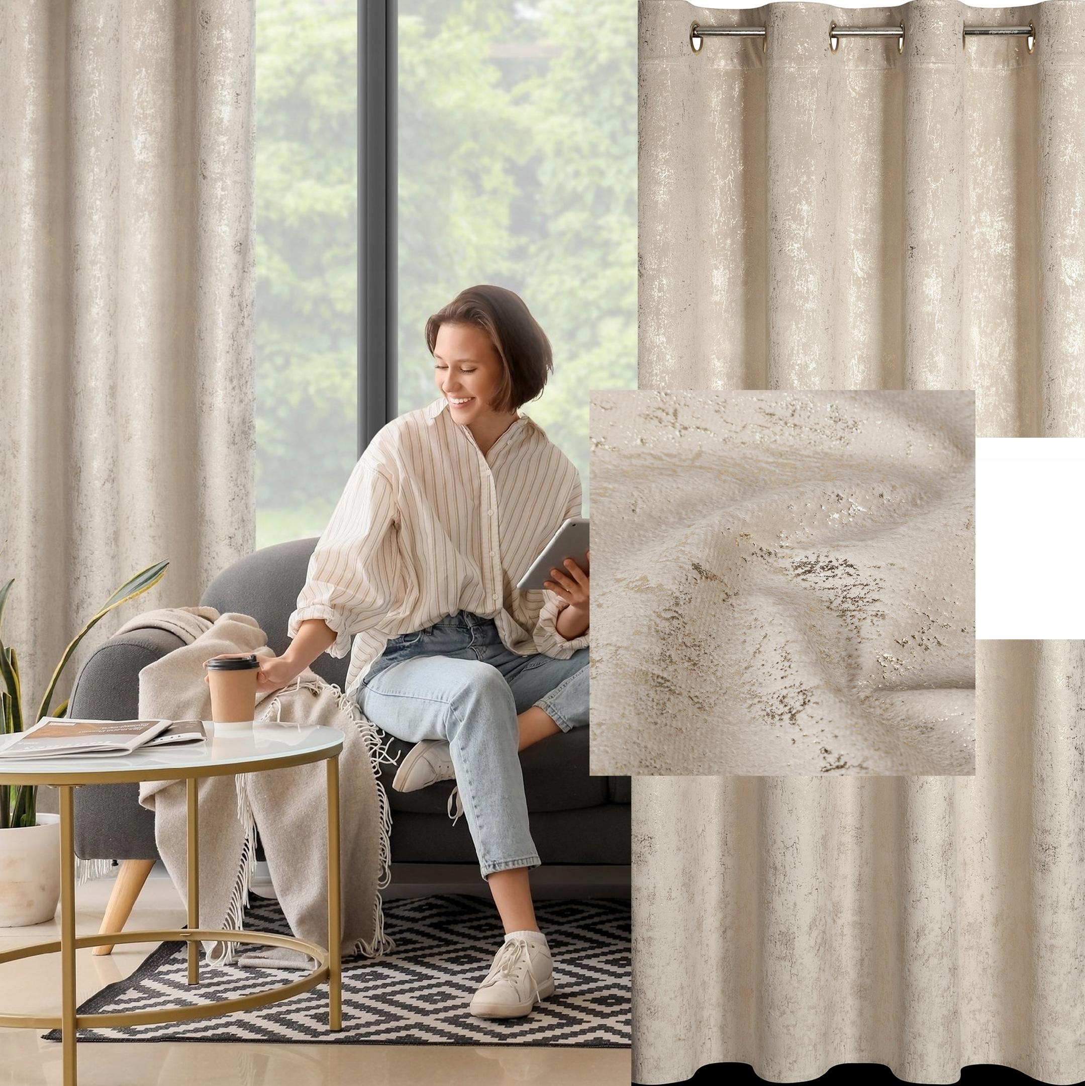Zasłona z miękkiej welwetowej tkaniny, ozdobiona eleganckim motywem złota na spokojnym, stonowanym tle, to idealna dekoracja dla nowoczesnych wnętrz w stylu glamour. Aksamitna, przyjemna w dotyku tkanina dodaje wnętrzu luksusowego charakteru, a jej subtelny połysk pięknie komponuje się z naturalnym światłem. Modny wzór wprowadza do pomieszczenia stylowy akcent, tworząc przytulną i modną przestrzeń. Nasze kolekcje są tworzone z pasji do pięknych wnętrz – stwórz z nami idealną oazę spokoju w swoim domu.