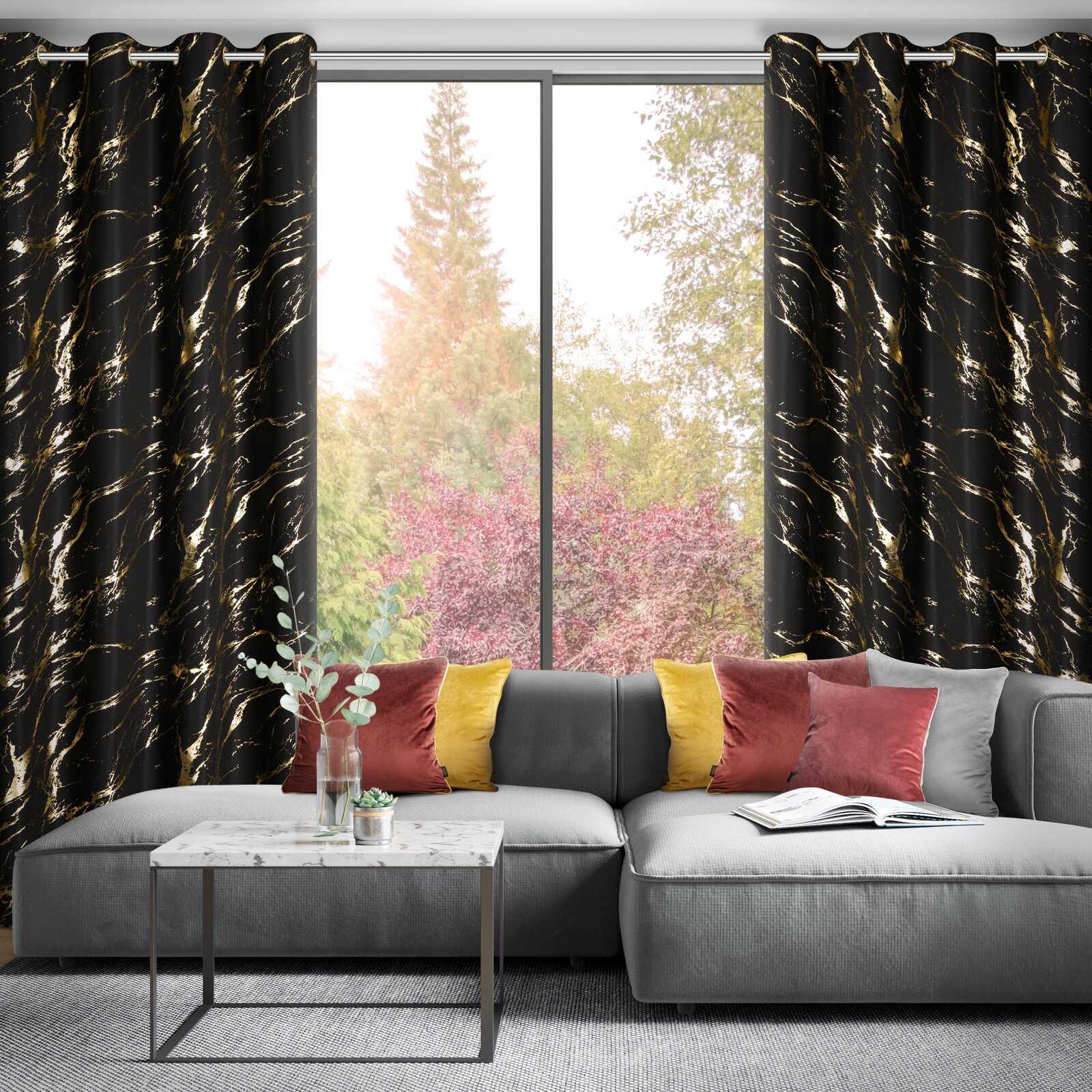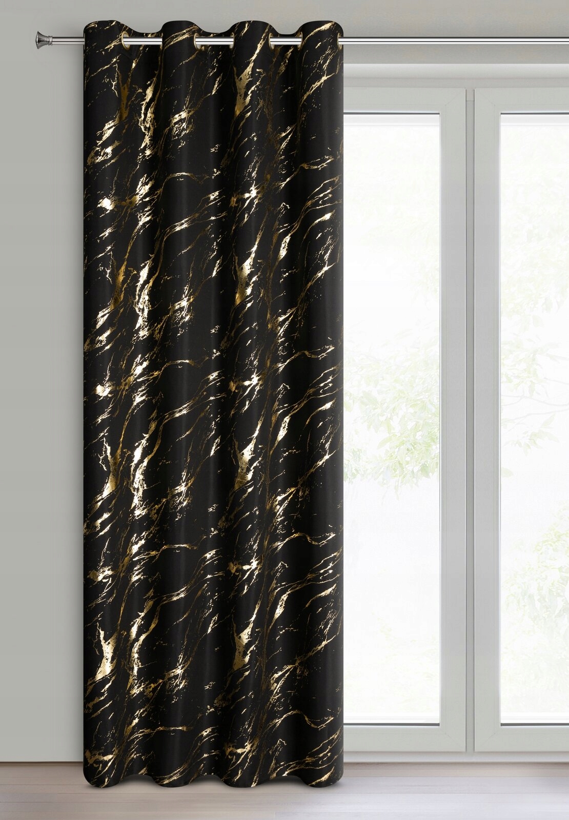 Polecamy zasłonę , którą zdobi nadruk marmurku, naniesiony na kontrastujące tło. Zasłona z lekkiej i delikatnej mikrofibry to dekoracja dedykowana szczególnie nowoczesnym wnętrzom. Zasłonę łatwo zawiesisz na karniszu z drążkiem – służą do tego praktyczne przelotki, dzięki którym zmiana zasłon jest szybka i łatwa, a tkanina układa się po zawieszeniu w miękkie i regularne fale. Delikatna i lekka tkanina subtelnie osłania okno nie powodując zaciemnienia wnętrza, ale tworząc w nim przyjemny klimat.