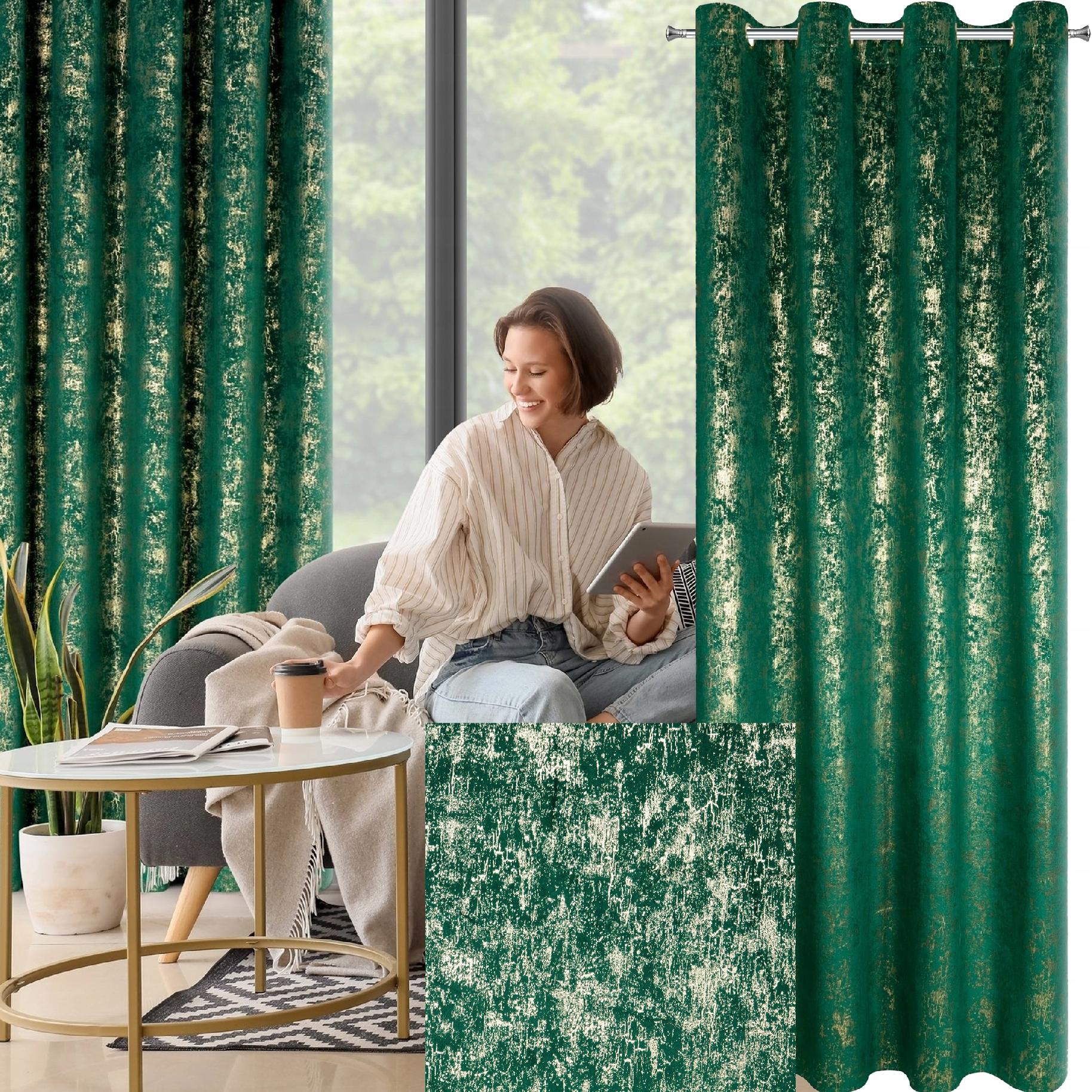 Zasłona 140X250 zielona welwetowa z nadrukiem przelotka