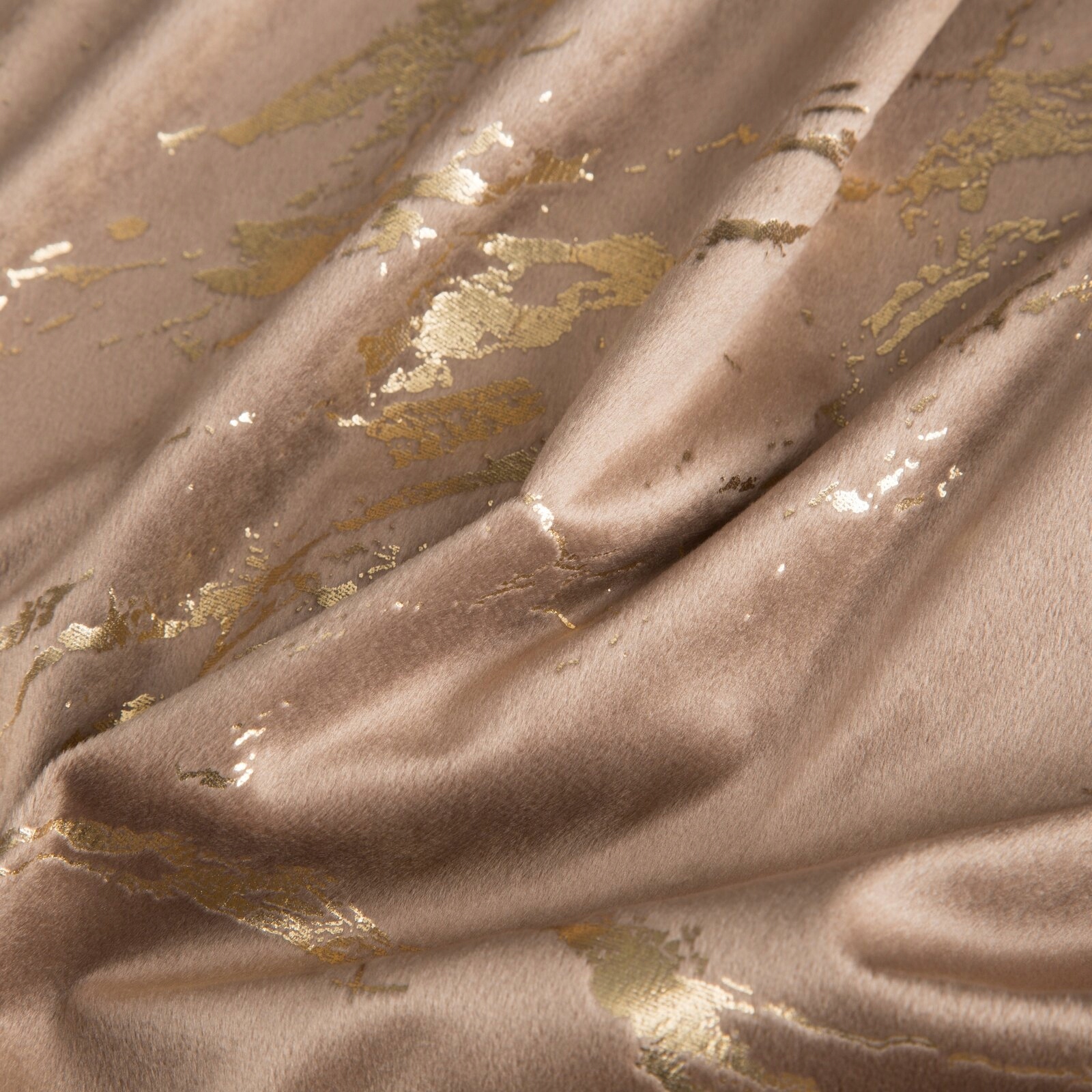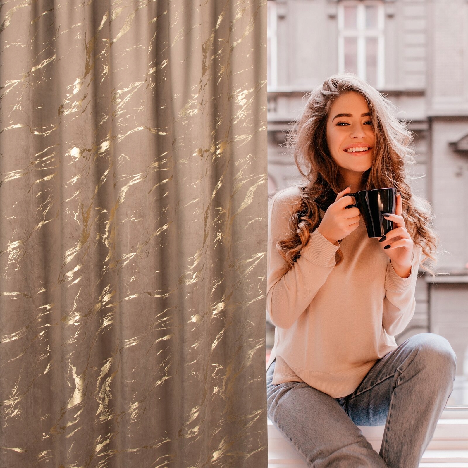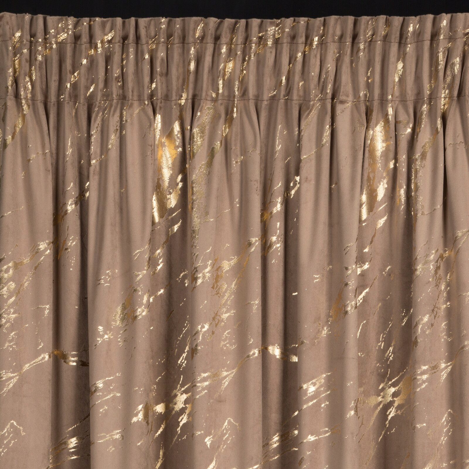 Zasłona z miękkiej welwetowej tkaniny, ozdobiona eleganckim motywem złotego marmuru na spokojnym, stonowanym tle, to idealna dekoracja dla nowoczesnych wnętrz w stylu glamour. Aksamitna, przyjemna w dotyku tkanina dodaje wnętrzu luksusowego charakteru, a jej subtelny połysk pięknie komponuje się z naturalnym światłem. Modny wzór wprowadza do pomieszczenia stylowy akcent, tworząc przytulną i modną przestrzeń. Nasze kolekcje są tworzone z pasji do pięknych wnętrz – stwórz z nami idealną oazę spokoju w swoim domu.