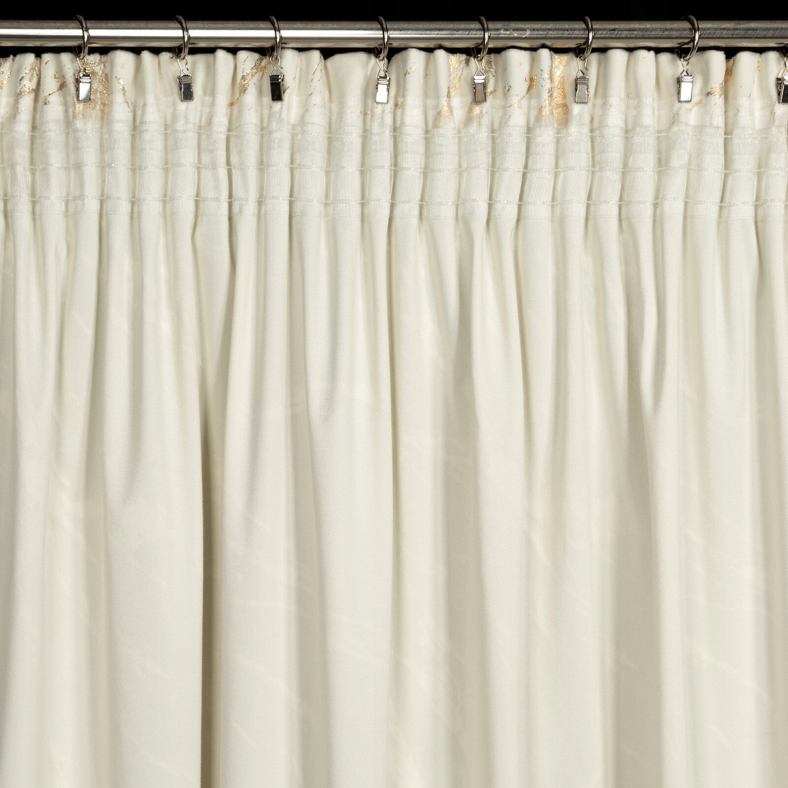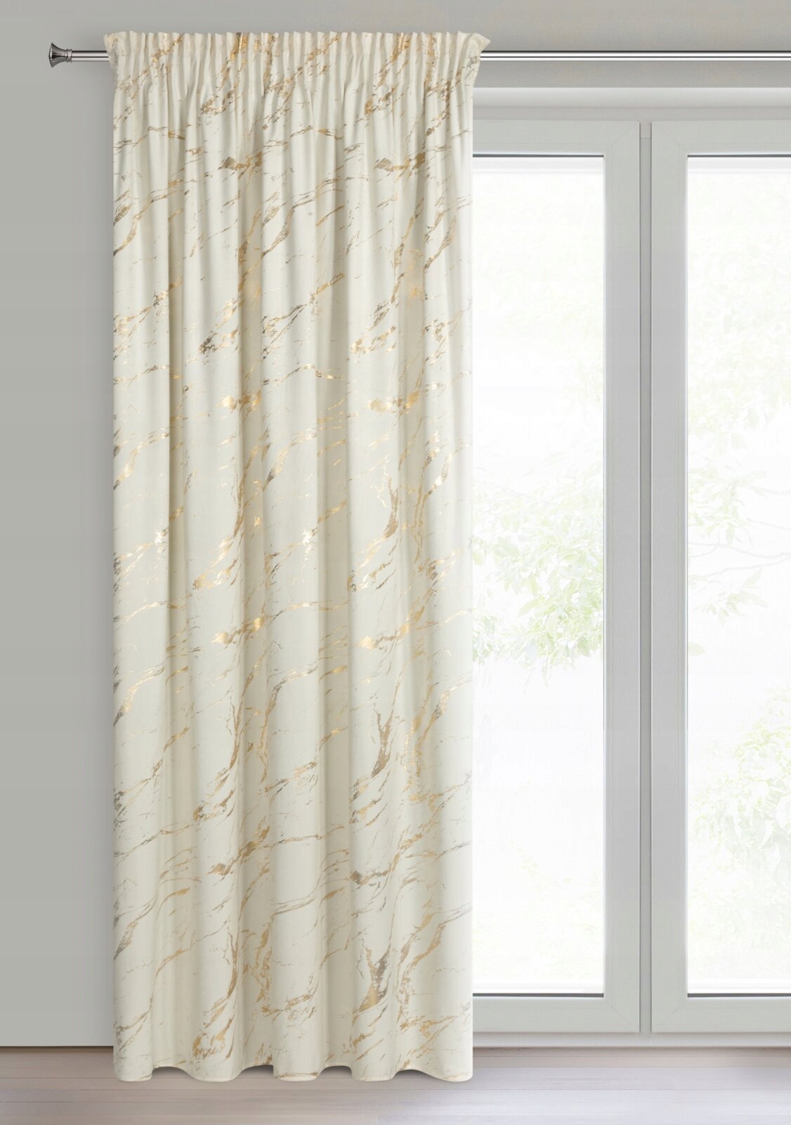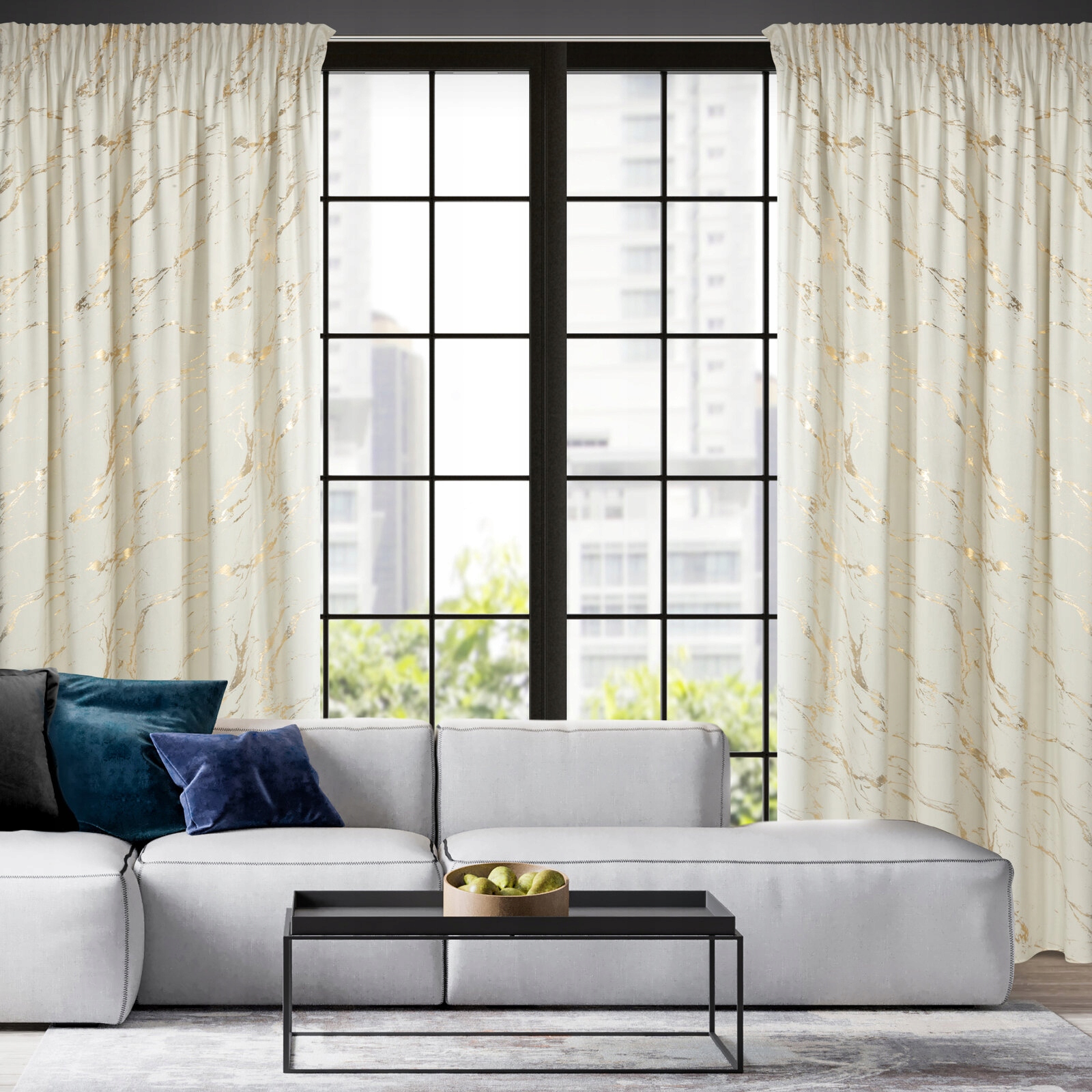 Zasłona z miękkiej welwetowej tkaniny, ozdobiona eleganckim motywem złotego marmuru na spokojnym, stonowanym tle, to idealna dekoracja dla nowoczesnych wnętrz w stylu glamour. Aksamitna, przyjemna w dotyku tkanina dodaje wnętrzu luksusowego charakteru, a jej subtelny połysk pięknie komponuje się z naturalnym światłem. Modny wzór wprowadza do pomieszczenia stylowy akcent, tworząc przytulną i modną przestrzeń. Nasze kolekcje są tworzone z pasji do pięknych wnętrz – stwórz z nami idealną oazę spokoju w swoim domu.