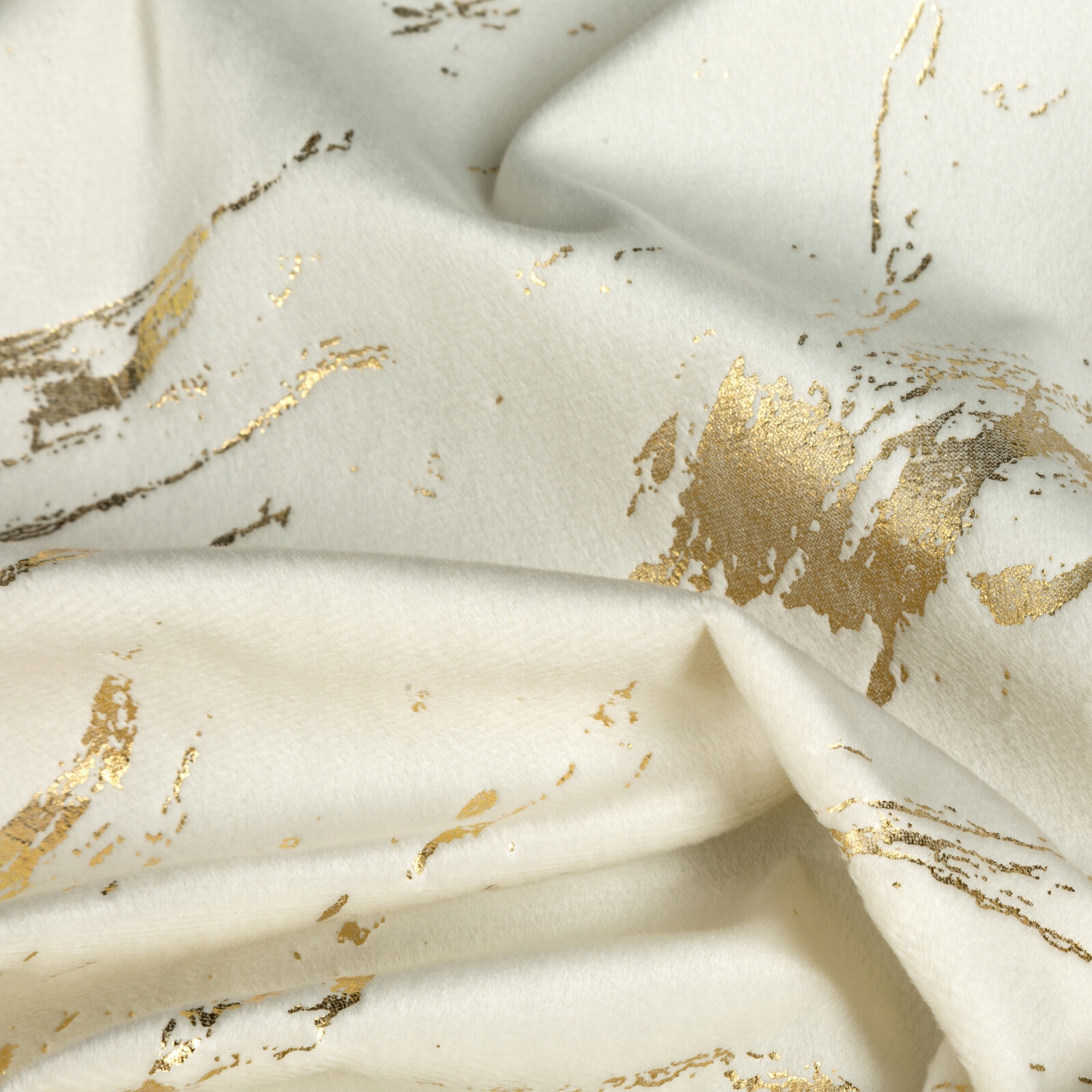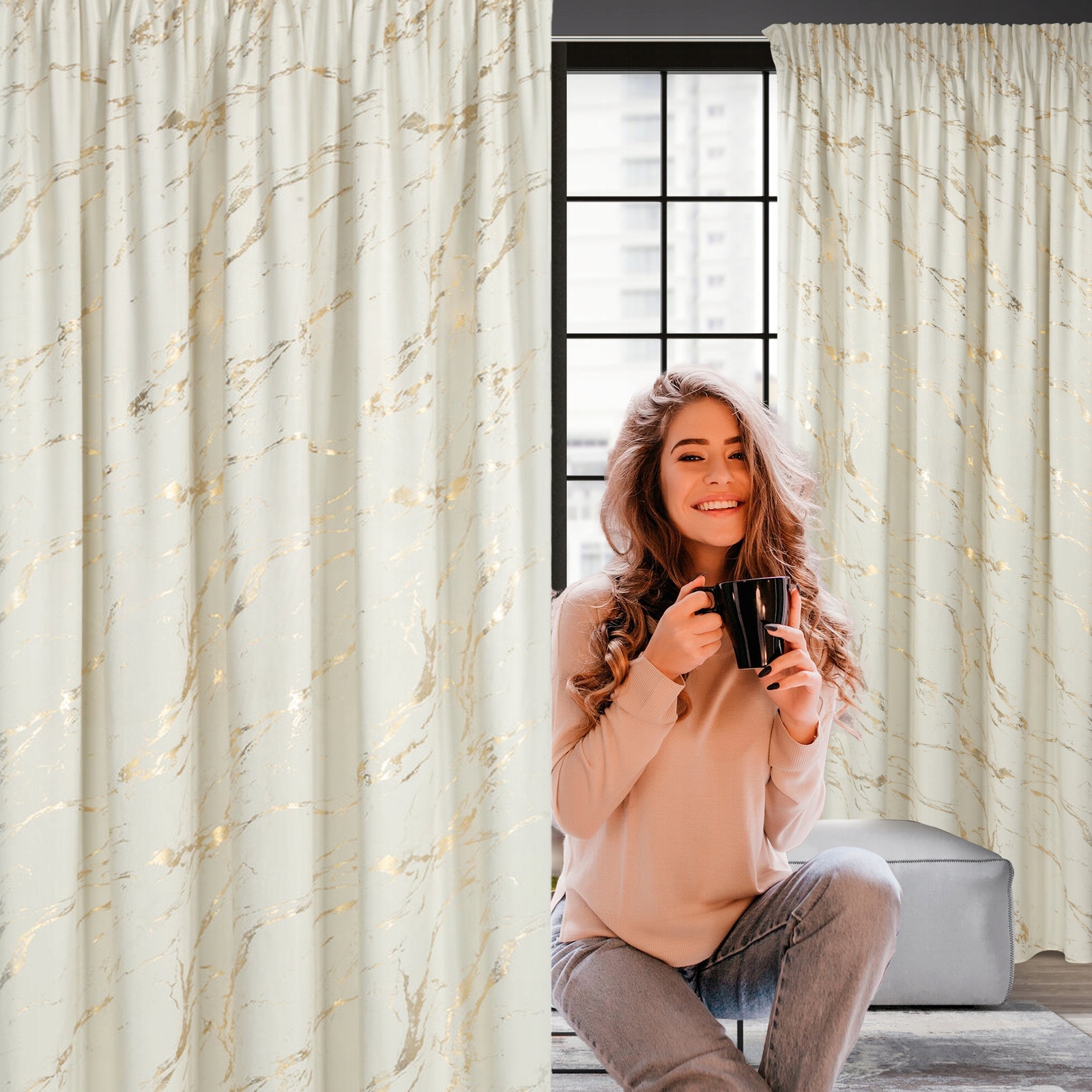 Zasłona z miękkiej welwetowej tkaniny, ozdobiona eleganckim motywem złotego marmuru na spokojnym, stonowanym tle, to idealna dekoracja dla nowoczesnych wnętrz w stylu glamour. Aksamitna, przyjemna w dotyku tkanina dodaje wnętrzu luksusowego charakteru, a jej subtelny połysk pięknie komponuje się z naturalnym światłem. Modny wzór wprowadza do pomieszczenia stylowy akcent, tworząc przytulną i modną przestrzeń. Nasze kolekcje są tworzone z pasji do pięknych wnętrz – stwórz z nami idealną oazę spokoju w swoim domu.