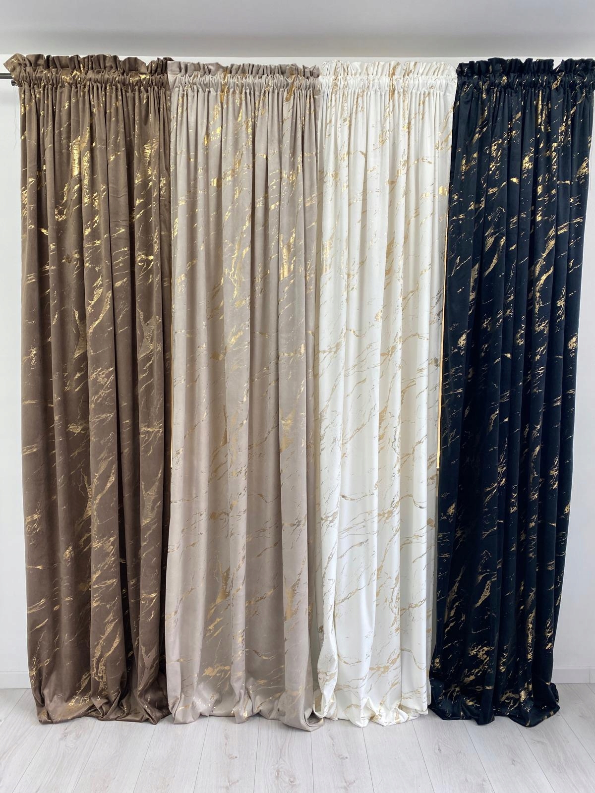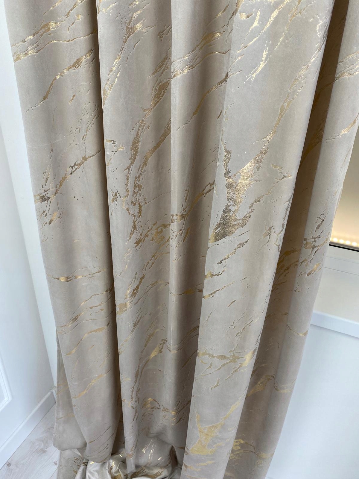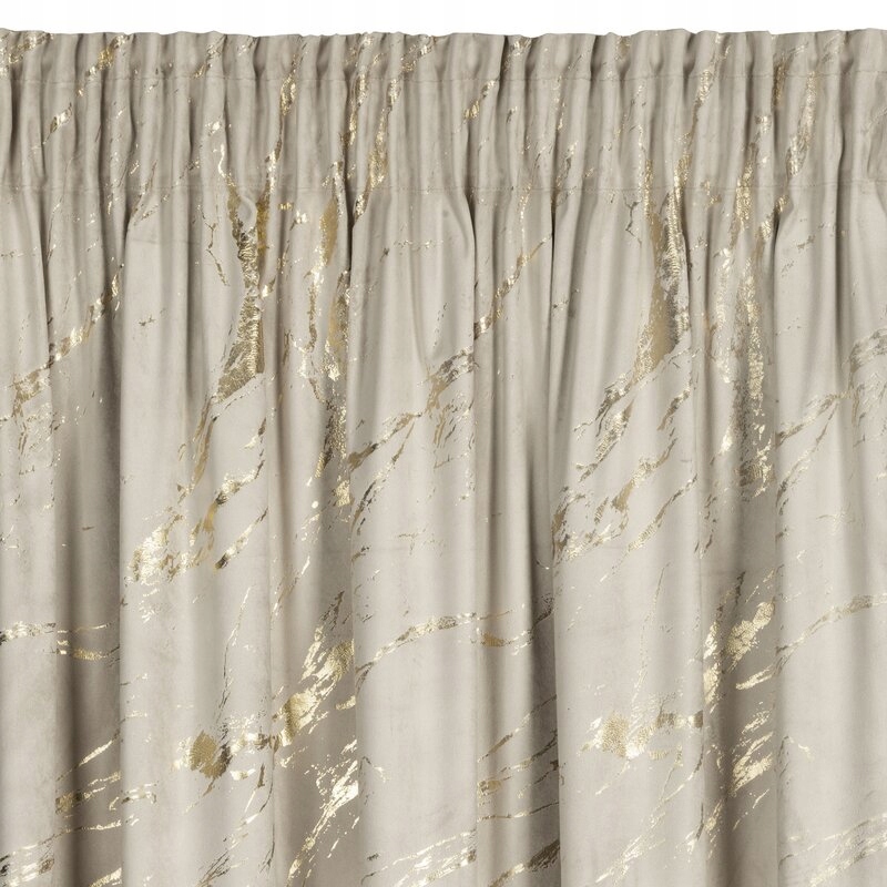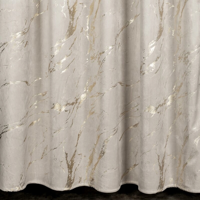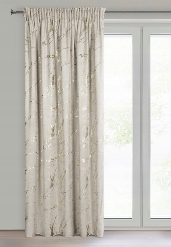 Zasłona MOLLY z miękkiej welwetowej tkaniny, ozdobiona eleganckim motywem złotego marmuru na spokojnym, stonowanym tle, to idealna dekoracja dla nowoczesnych wnętrz w stylu glamour. Aksamitna, przyjemna w dotyku tkanina dodaje wnętrzu luksusowego charakteru, a jej subtelny połysk pięknie komponuje się z naturalnym światłem. Dzięki praktycznym przelotkom zasłonę można łatwo zawiesić na karniszu drążkowym, a równomierne fałdy nadają jej elegancki wygląd. Szybka zmiana dekoracji to dodatkowa zaleta. Modny wzór wprowadza do pomieszczenia stylowy akcent, tworząc przytulną i modną przestrzeń. Nasze kolekcje są tworzone z pasji do pięknych wnętrz – stwórz z nami idealną oazę spokoju w swoim domu.