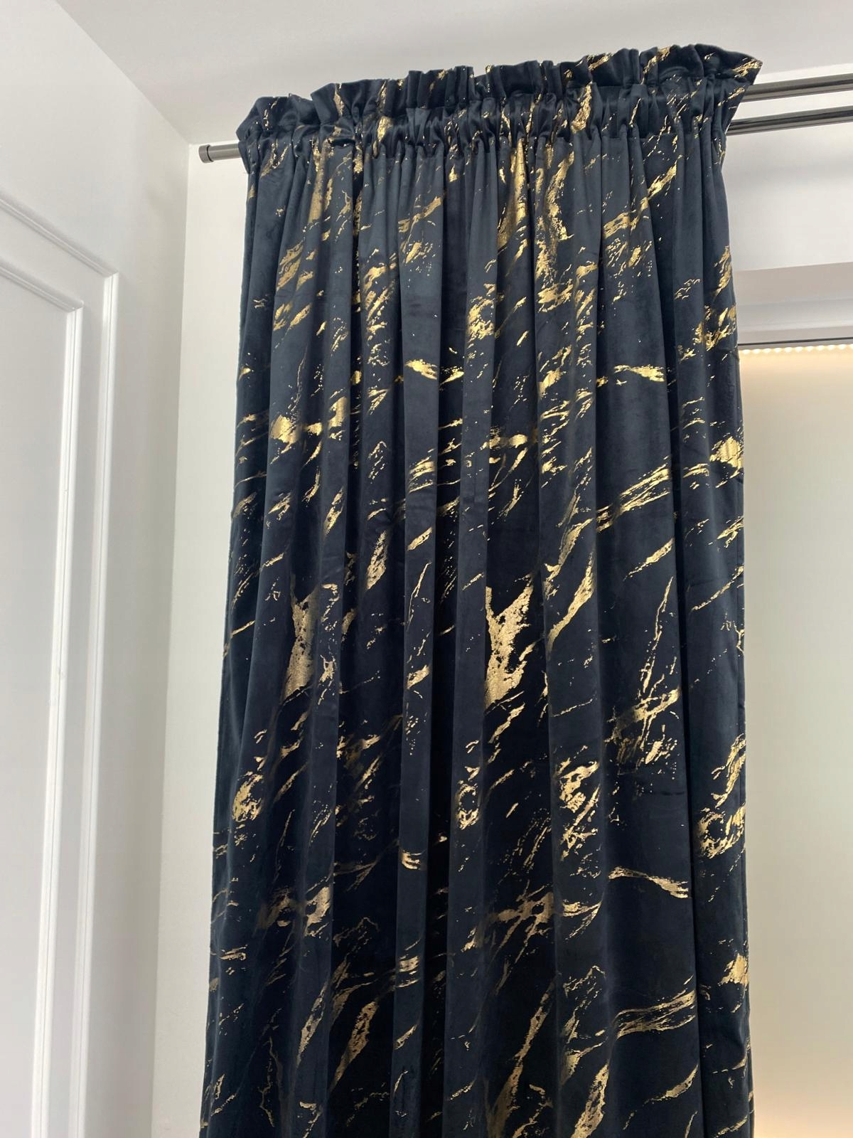 Zasłona MOLLY z miękkiej welwetowej tkaniny, ozdobiona eleganckim motywem złotego marmuru na spokojnym, stonowanym tle, to idealna dekoracja dla nowoczesnych wnętrz w stylu glamour. Aksamitna, przyjemna w dotyku tkanina dodaje wnętrzu luksusowego charakteru, a jej subtelny połysk pięknie komponuje się z naturalnym światłem. Modny wzór wprowadza do pomieszczenia stylowy akcent, tworząc przytulną i modną przestrzeń. Nasze kolekcje są tworzone z pasji do pięknych wnętrz – stwórz z nami idealną oazę spokoju w swoim domu.