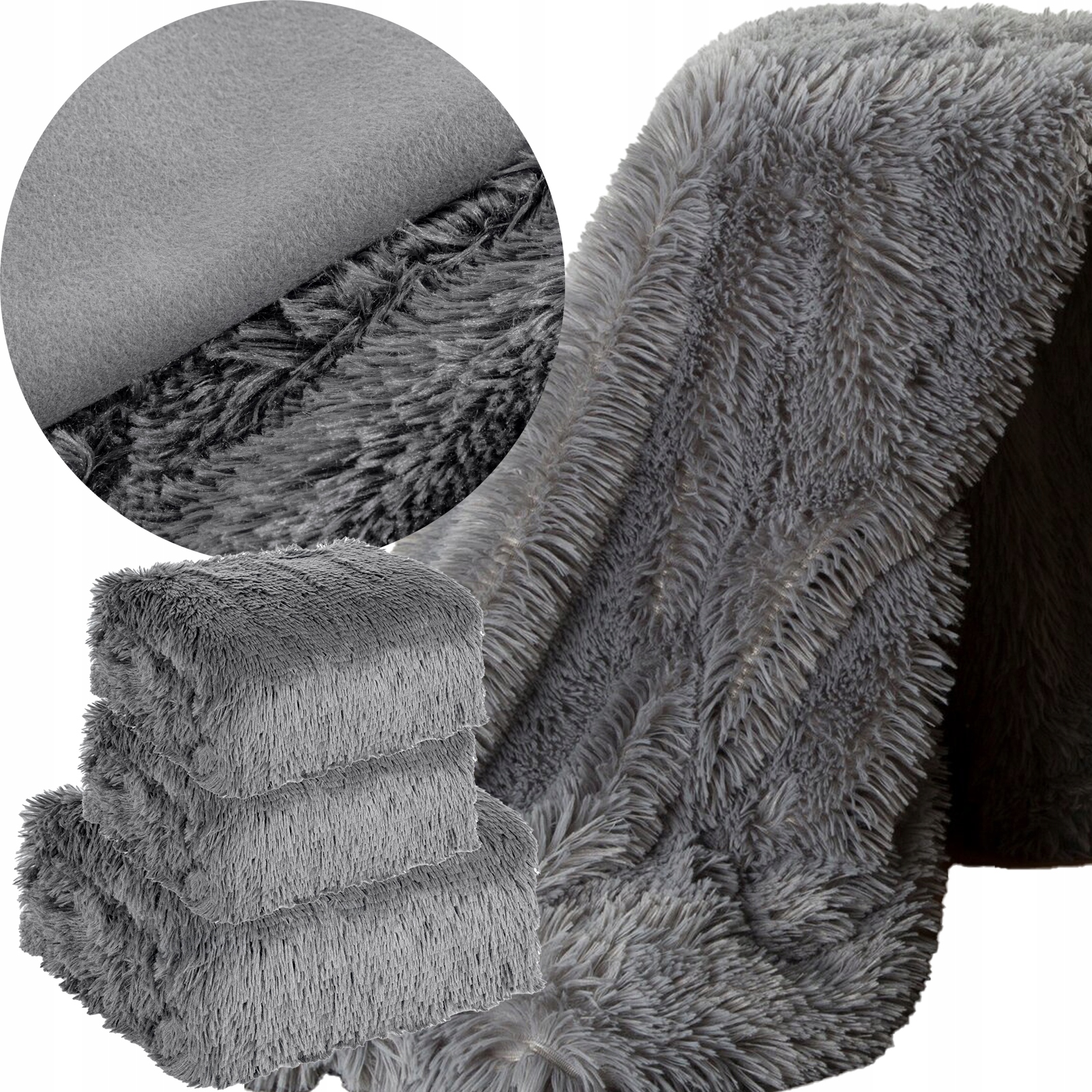 Miękki i przyjemny w dotyku koc o strukturze futra. Zestaw składa się z trzech kocy, 1 x 170 cm x 210 cm + 2 x 70×160 cm.